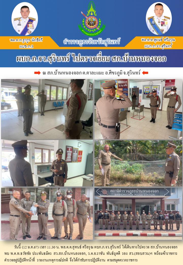 12 ม.ค. 2567 15:12:27ผบก.ภ.จว.สุรินทร์ ไปตรวจเยี่ยม สภ.บ้านหนองจอก วันนี้ (12 ม.ค.67) เวลา 11.30 น. พล.ต.ต.สุคนธ์ ศรีอรุณ ผบก.ภ.จว.สุรินทร์ ได้เดินทางไปตรวจ สภ.บ้านหนองจอก พบ พ.ต.ท.ธวัชชัย ประพันธมิตร สว.สภ.บ้านหนองจอก, ร.ต.อ.ราชัน พันธ์บุดดี รอง สว.(สอบสวน)ฯ พร้อมข้าราชการตำรวจอยู่ปฏิบัติหน้าที่ รายงานเหตุการณ์ปกติ จึ...