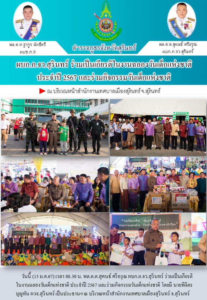 13 ม.ค. 2567 15:17:00ผบก.ภ.จว.สุรินทร์ ร่วมเป็นเกียรติในงานฉลองวันเด็กแห่งชาติ ประจำปี 2567 และร่วมกิจกรรมวันเด็กแห่งชาติ วันนี้ (13 ม.ค.67) เวลา 08.30 น. พล.ต.ต.สุคนธ์ ศรีอรุณ ผบก.ภ.จว.สุรินทร์ ร่วมเป็นเกียรติในงานฉลองวันเด็กแห่งชาติ ประจำปี 2567 และร่วมกิจกรรมวันเด็กแห่งชาติ โดยมี นายพิจิตร บุญทัน ผวจ.สุรินทร์ เป็นปร...