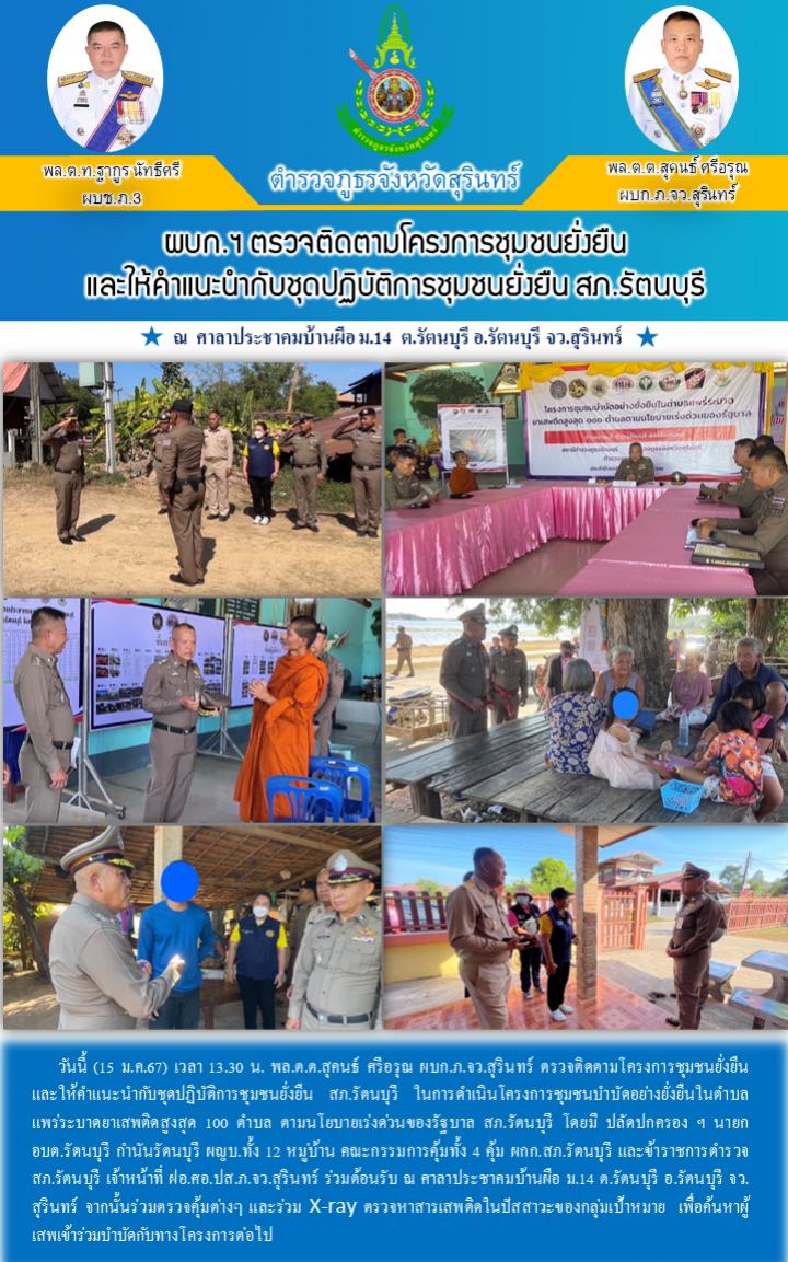 15 ม.ค. 2567 19:48:49ผบก.ฯ ตรวจติดตามโครงการชุมชนยั่งยืน และให้คำแนะนำกับชุดปฏิบัติการชุมชนยั่งยืน สภ.รัตนบุรี วันนี้ (15 ม.ค.67) เวลา 13.30 น. พล.ต.ต.สุคนธ์ ศรีอรุณ ผบก.ภ.จว.สุรินทร์ ตรวจติดตามโครงการชุมชนยั่งยืน และให้คำแนะนำกับชุดปฏิบัติการชุมชนยั่งยืน สภ.รัตนบุรี ในการดำเนินโครงการชุมชนบำบัดอย่างยั่งยืนในตำบ...