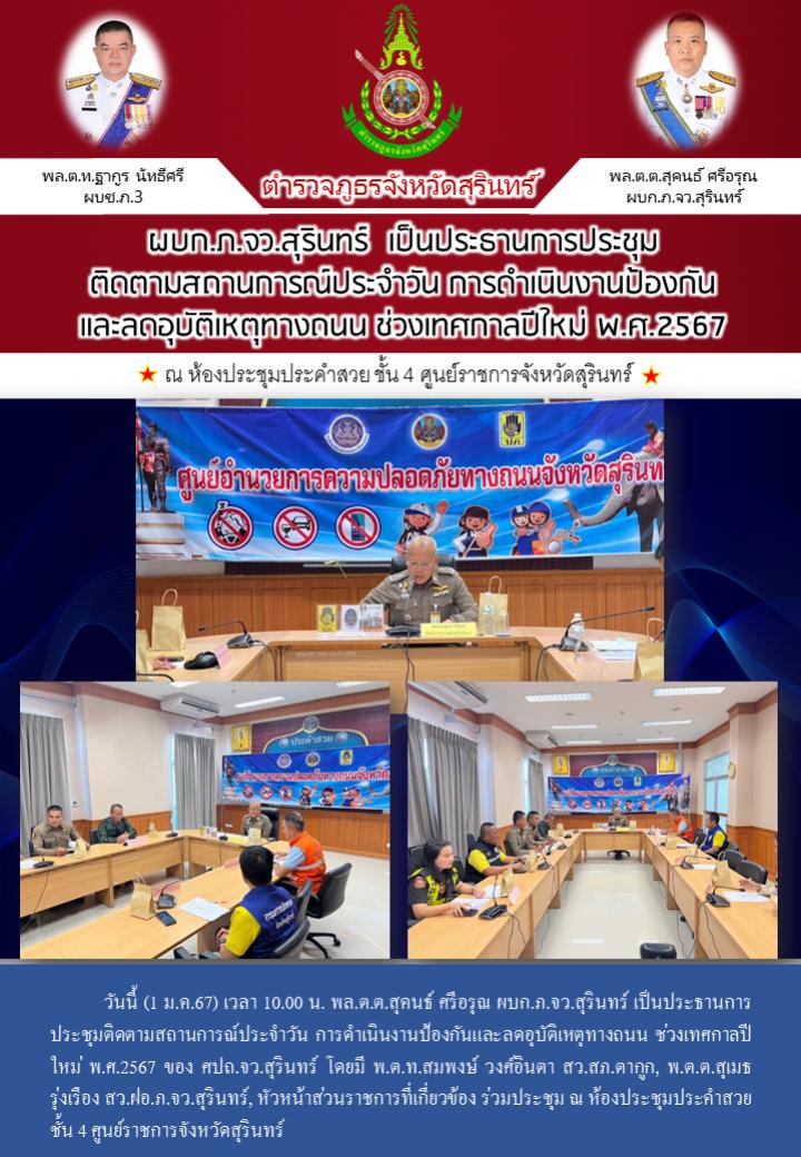 1 ม.ค. 2567 11:00:25ผบก.ภ.จว.สุรินทร์ เป็นประธานการประชุมติดตามสถานการณ์ประจำวัน การดำเนินงานป้องกันและลดอุบัติเหตุทางถนน ช่วงเทศกาลปีใหม่ พ.ศ.2567 วันนี้ (1 ม.ค.67) เวลา 10.00 น. พล.ต.ต.สุคนธ์ ศรีอรุณ ผบก.ภ.จว.สุรินทร์ เป็นประธานการประชุมติดตามสถานการณ์ประจำวัน การดำเนินงานป้องกันและลดอุบัติเหตุทางถนน ช่วงเทศกาลปีให...