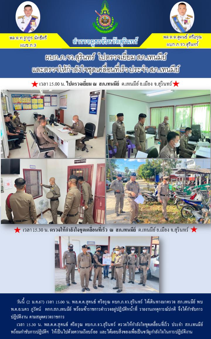 2 ม.ค. 2567 17:24:48ผบก.ภ.จว.สุรินทร์ ไปตรวจเยี่ยม สภ.เทนมีย์ และตรวจให้กำลังใจชุดเคลื่อนที่เร็ว ประจำ สภ.เทนมีย์ วันนี้ (2 ม.ค.67) เวลา 15.00 น. พล.ต.ต.สุคนธ์ ศรีอรุณ ผบก.ภ.จว.สุรินทร์ ได้เดินทางมาตรวจ สภ.เทนมีย์ พบ พ.ต.อ.นคร ภู่รัตน์ ผกก.สภ.เทนมีย์ พร้อมข้าราชการตำรวจอยู่ปฏิบัติหน้าที่ รายงานเหตุการณ์ปกติ จึงได้ก...
