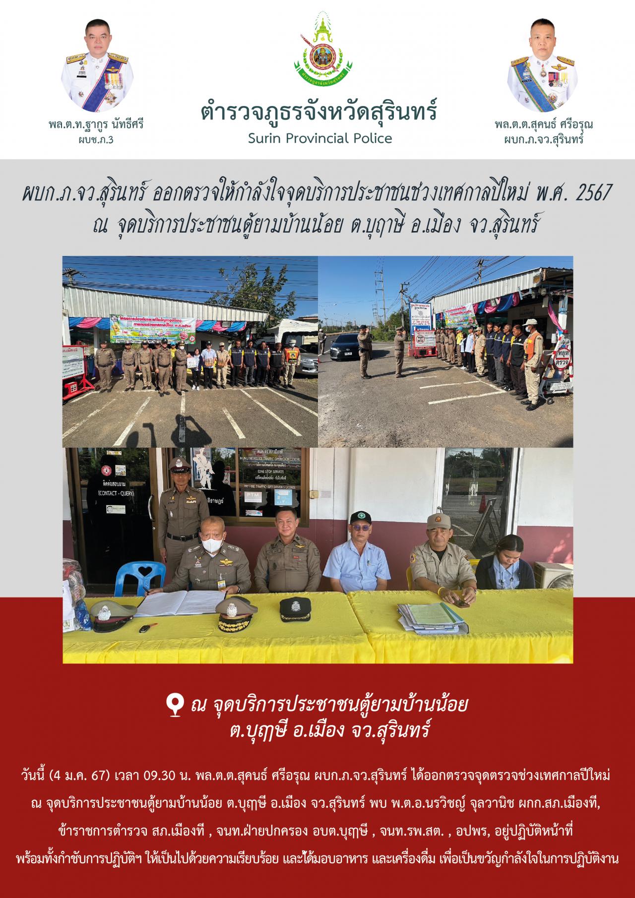 4 ม.ค. 2567 12:58:40ผบก.ภ.จว.สุรินทร์ ออกตรวจให้กำลังใจจุดบริการประชาชนช่วงเทศกาลปีใหม่ พ.ศ. 2567 ณ จุดบริการประชาชนตู้ยามบ้านน้อย ต.บุฤาษี อ.เมือง จว.สุรินทร์ วันนี้ (4 ม.ค. 67) เวลา 09.30 น. พล.ต.ต.สุคนธ์ ศรีอรุณ ผบก.ภ.จว.สุรินทร์ ได้ออกตรวจจุดตรวจช่วงเทศกาลปีใหม่ ณ จุดบริการประชาชนตู้ยามบ้านน้อย ต.บุฤาษี อ.เมือง จ...