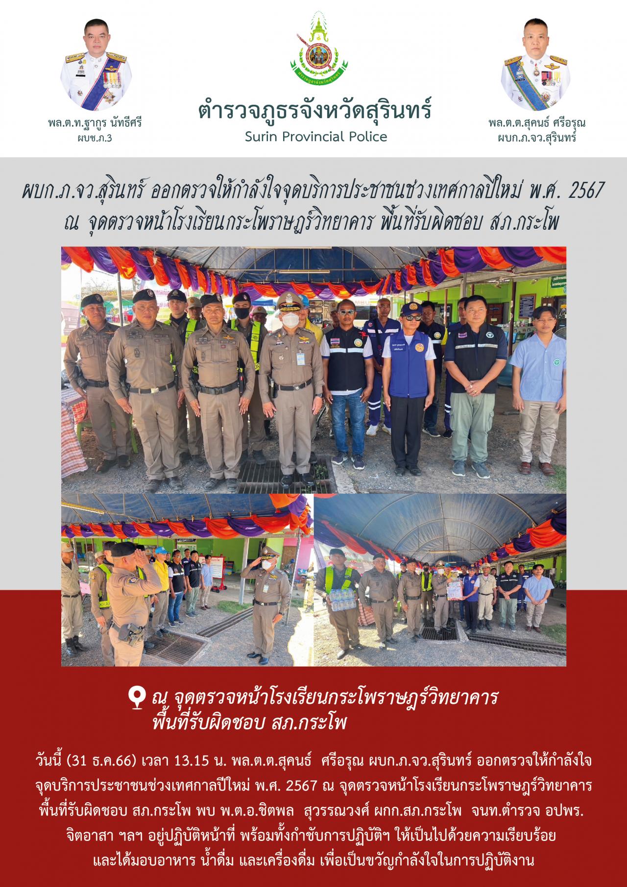 31 ธ.ค. 2566 19:40:24ผบก.ภ.จว.สุรินทร์ ออกตรวจให้กำลังใจจุดบริการประชาชนช่วงเทศกาลปีใหม่ พ.ศ. 2567 ณ จุดตรวจหน้าโรงเรียนกระโพราษฎร์วิทยาคาร พื้นที่รับผิดชอบ สภ.กระโพ วันนี้ (31 ธ.ค.66) เวลา 13.15 น. พล.ต.ต.สุคนธ์ ศรีอรุณ ผบก.ภ.จว.สุรินทร์ ออกตรวจให้กำลังใจ จุดบริการประชาชนช่วงเทศกาลปีใหม่ พ.ศ. 2567 ณ จุดตรวจหน้าโรงเรี...