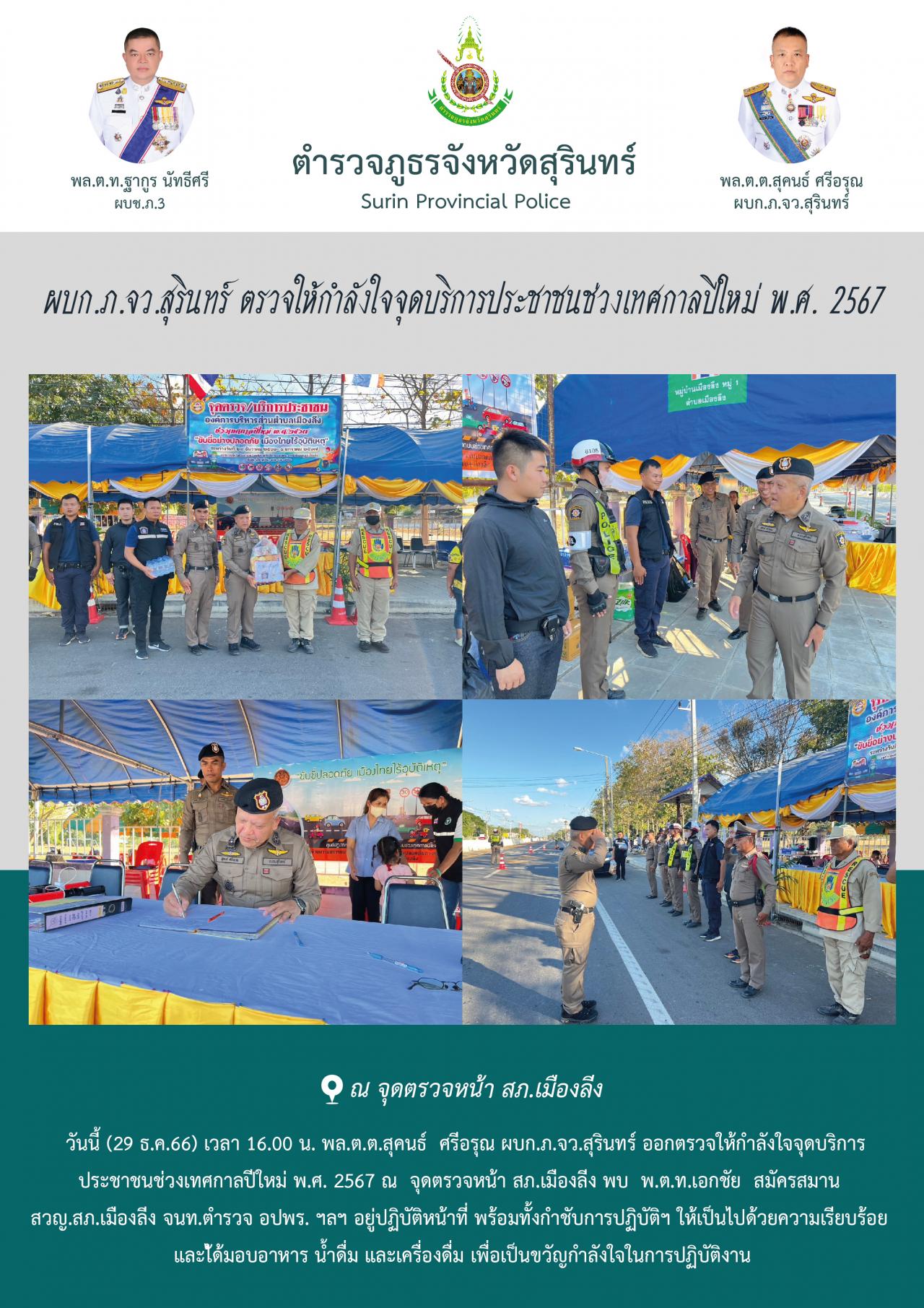 29 ธ.ค. 2566 17:10:04ผบก.ภ.จว.สุรินทร์ ตรวจให้กำลังใจจุดบริการประชาชนช่วงเทศกาลปีใหม่ พ.ศ. 2567 วันนี้ (29 ธ.ค.66) เวลา 16.00 น. พล.ต.ต.สุคนธ์ ศรีอรุณ ผบก.ภ.จว.สุรินทร์ ออกตรวจให้กำลังใจจุดบริการ ประชาชนช่วงเทศกาลปีใหม่ พ.ศ. 2567 ณ จุดตรวจหน้า สภ.เมืองลีง พบ พ.ต.ท.เอกชัย สมัครสมาน สวญ.สภ.เมืองลีง จนท.ตำรวจ อปพร...