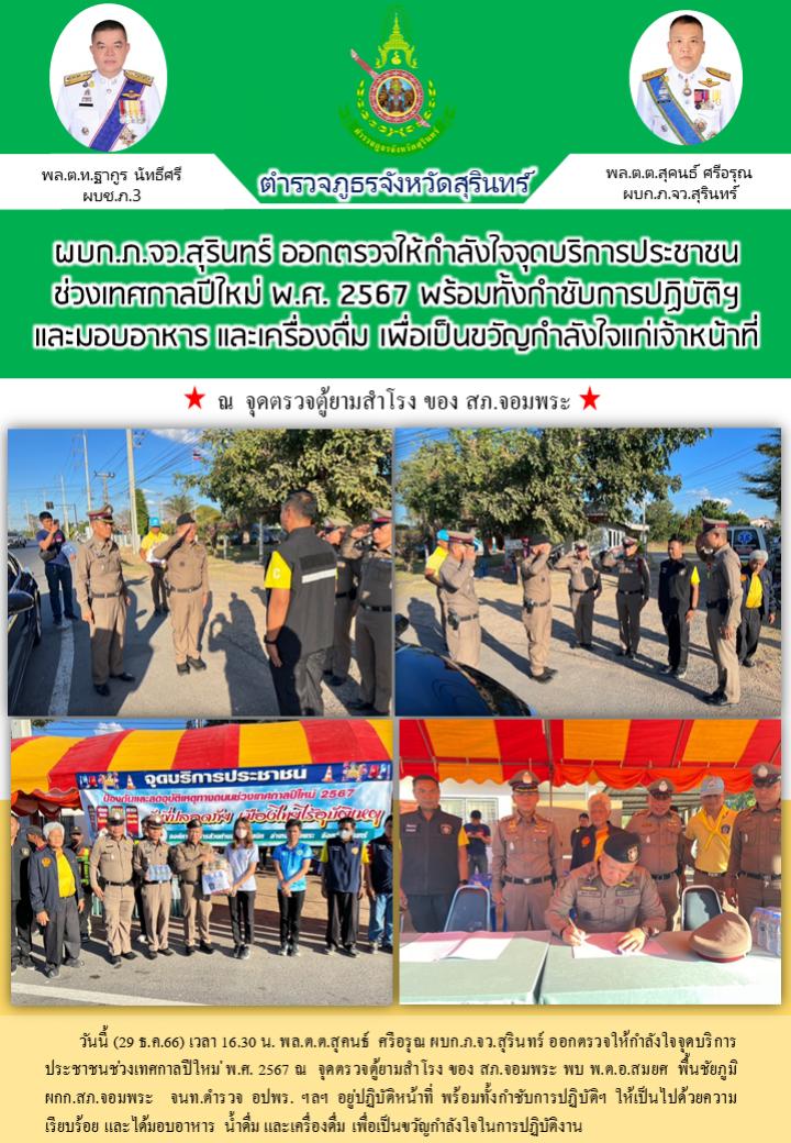 29 ธ.ค. 2566 23:24:25ผบก.ภ.จว.สุรินทร์ ออกตรวจให้กำลังใจจุดบริการประชาชน ช่วงเทศกาลปีใหม่ พ.ศ. 2567 พร้อมทั้งกำชับการปฏิบัติฯ และมอบอาหาร และเครื่องดื่ม เพื่อเป็นขวัญกำลังใจแก่เจ้าหน้าที่ วันนี้ (29 ธ.ค.66) เวลา 16.30 น. พล.ต.ต.สุคนธ์ ศรีอรุณ ผบก.ภ.จว.สุรินทร์ ออกตรวจให้กำลังใจจุดบริการประชาชนช่วงเทศกาลปีใหม่ พ.ศ. 256...