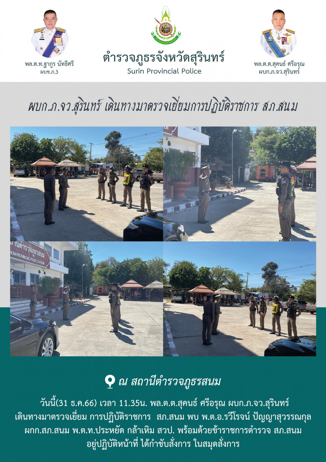 31 ธ.ค. 2566 19:25:25ผบก.ภ.จว.สุรินทร์ เดินทางมาตรวจเยี่ยมการปฏิบัติราชการ สภ.สนม วันนี้(31 ธ.ค.66) เวลา 11.35น. พล.ต.ต.สุคนธ์ ศรีอรุณ ผบก.ภ.จว.สุรินทร์ เดินทางมาตรวจเยี่ยม การปฏิบัติราชการ สภ.สนม พบ พ.ต.อ.รวีโรจน์ ปัญญาสุวรรณกุล ผกก.สภ.สนม พ.ต.ท.ประหยัด กล้าเหิม สวป. พร้อมด้วยข้าราชการตำรวจ สภ.สนม อยู่ปฏิบัติหน้าที่...