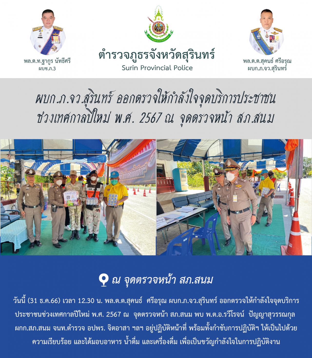 31 ธ.ค. 2566 19:30:20ผบก.ภ.จว.สุรินทร์ ออกตรวจให้กำลังใจจุดบริการประชาชน ช่วงเทศกาลปีใหม่ พ.ศ. 2567 ณ จุดตรวจหน้า สภ.สนม วันนี้ (31 ธ.ค.66) เวลา 12.30 น. พล.ต.ต.สุคนธ์ ศรีอรุณ ผบก.ภ.จว.สุรินทร์ ออกตรวจให้กำลังใจจุดบริการ ประชาชนช่วงเทศกาลปีใหม่ พ.ศ. 2567 ณ จุดตรวจหน้า สภ.สนม พบ พ.ต.อ.รวีโรจน์ ปัญญาสุวรรณกุล ผกก.สภ....