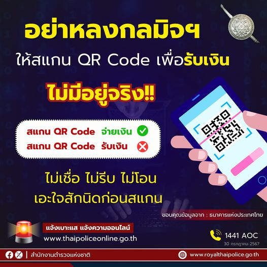 1 ส.ค. 2567 09:26:15📢รู้ไว้ ไม่หลงกล อย่าหลงเชื่อมิจฯ ‼️ ให้สแกน QR Code ( คิวอาร์ โค้ด ) เพื่อ "รับเงิน" ธนาคารแห่งประเทศไทยย้ำเตือนว่า สแกน QR Code เพื่อรับเงิน ไม่มีอยู่จริง มีแต่สแกนเพื่อจ่ายเงินเท่านั้น ไม่เชื่อ ไม่รีบ ไม่โอน ไม่ตกเป็นเหยื่อ เอะใจสักนิดก่อนสแกน ⚠️❔ ด้วยความปรารถนาดีจาก "สำนักงานตำรวจแห่งชาติ" #เต...