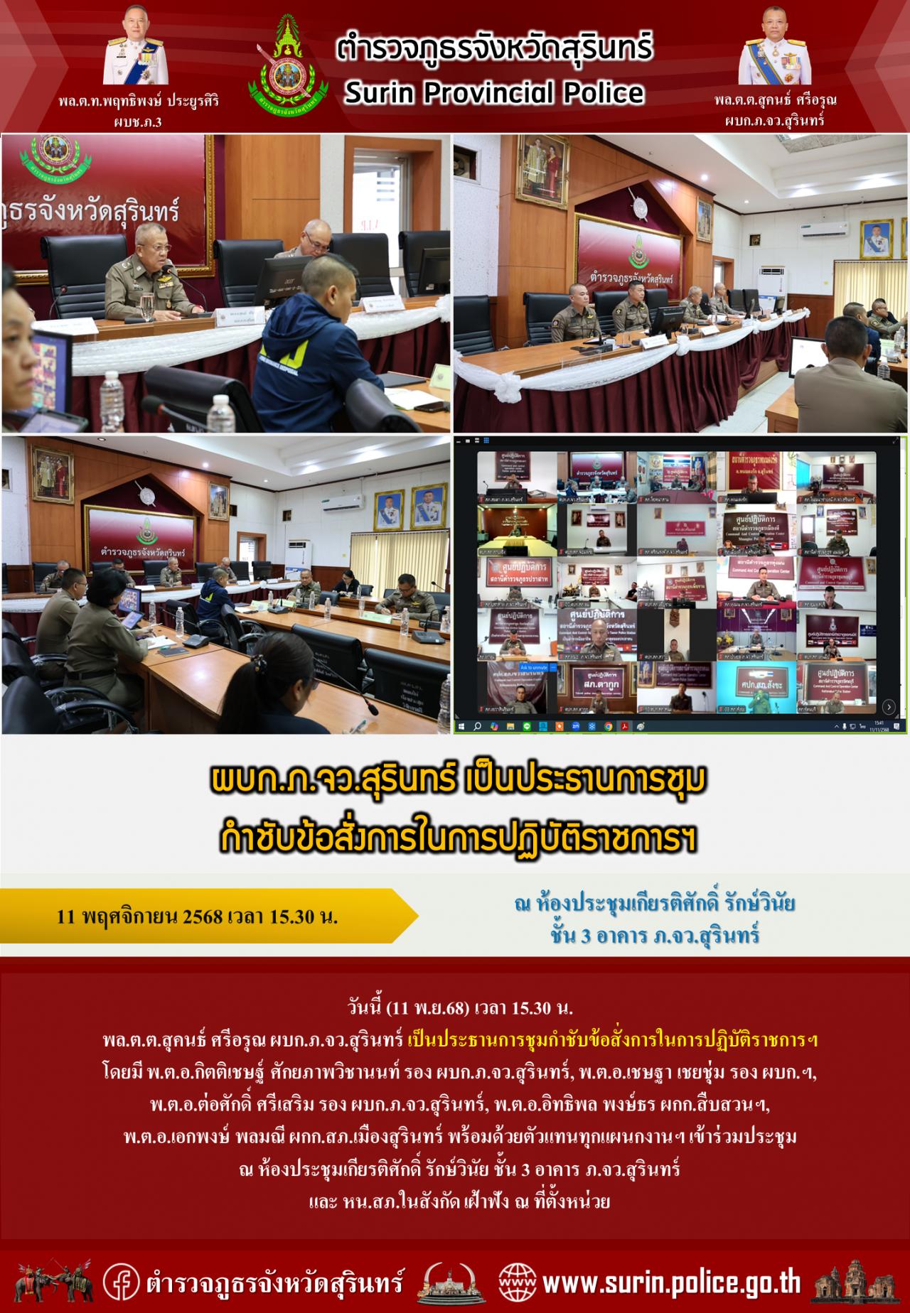 12 พ.ย. 2568 16:05:24วันนี้ (12 พ.ย.68) เวลา 13.30 น. พล.ต.ต.สุคนธ์ ศรีอรุณ ผบก.ภ.จว.สุรินทร์ เป็นประธานการประชุมติดตามความพร้อมในภารกิจรักษาความสงบเรียบร้อย และจัดการจราจร “มหัศจรรย์งานช้าง ประจำปี 2568” โดยมี พ.ต.อ.วีระพันธ์ ณ ลำปาง รอง ผบก.ภ.จว.สุรินทร์, พ.ต.อ.อิทธิพล พงษ์ธร ผกก.สืบสวนฯ, พ.ต.อ.เอกพงษ์ พลมณี ผกก.สภ...
