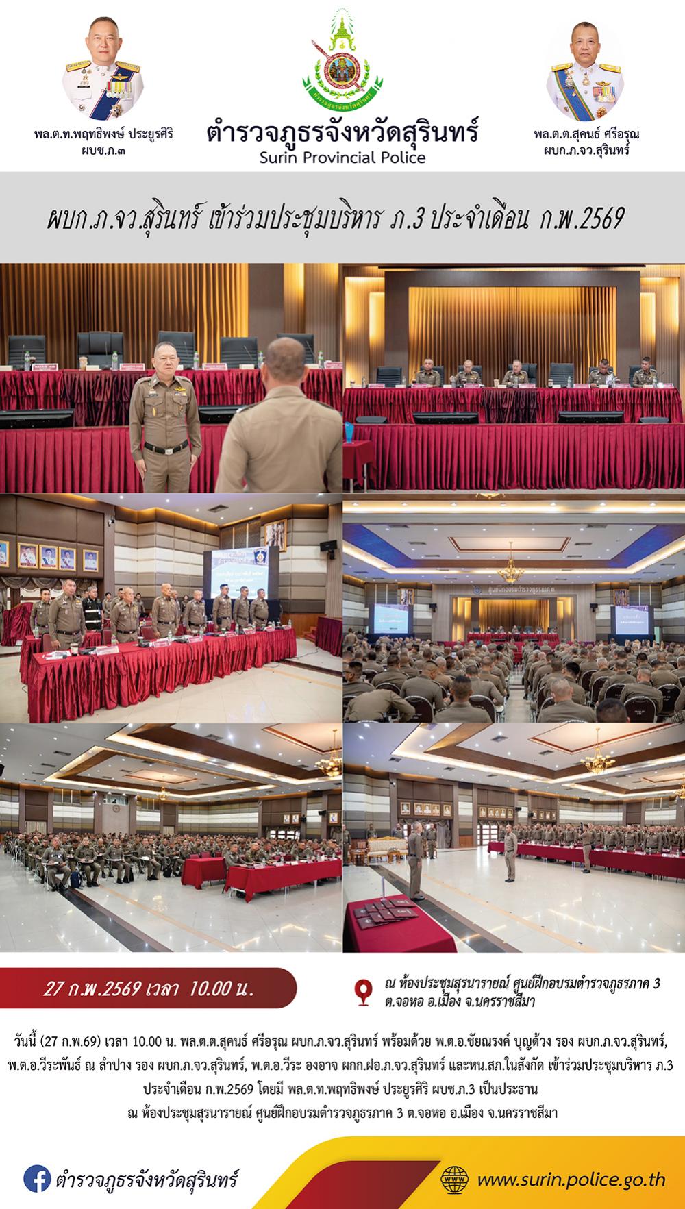 27 ก.พ. 2569 16:11:29ผบก.ภ.จว.สุรินทร์ เข้าร่วมประชุมบริหาร ภ.3 ประจำเดือน ก.พ.2569 วันนี้ (27 ก.พ.69) เวลา 10.00 น. พล.ต.ต.สุคนธ์ ศรีอรุณ ผบก.ภ.จว.สุรินทร์ พร้อมด้วย พ.ต.อ.ชัยณรงค์ บุญด้วง รอง ผบก.ภ.จว.สุรินทร์, พ.ต.อ.วีระพันธ์ ณ ลำปาง รอง ผบก.ภ.จว.สุรินทร์, พ.ต.อ.วีระ องอาจ ผกก.ฝอ.ภ.จว.สุรินทร์ และหน.สภ.ในสังกัด เข...