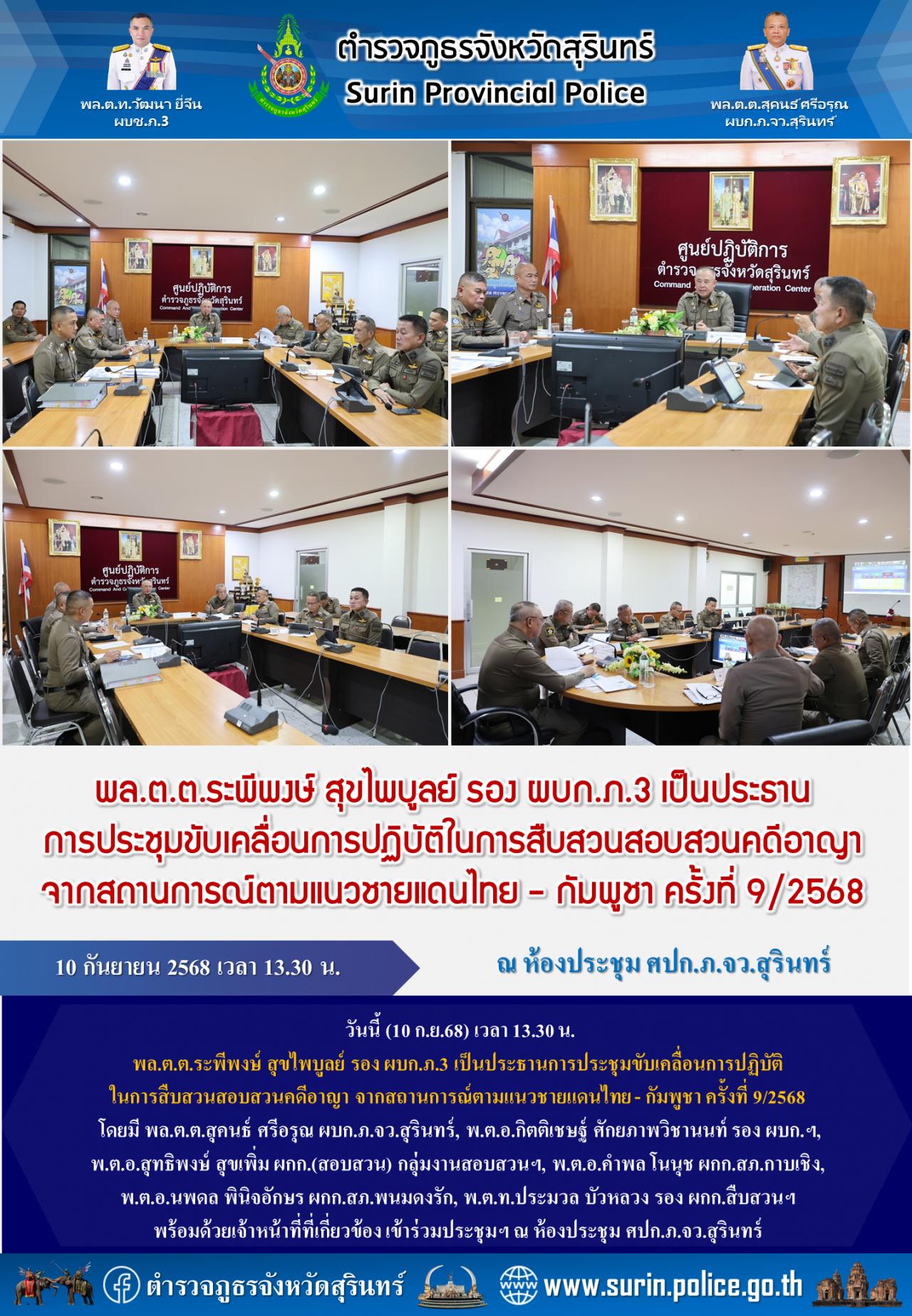 10 ก.ย. 2568 18:32:46 วันนี้ (10 ก.ย.68) เวลา 13.30 น. พล.ต.ต.ระพีพงษ์ สุขไพบูลย์ รอง ผบก.ภ.3 เป็นประธานการประชุมขับเคลื่อนการปฏิบัติในการสืบสวนสอบสวนคดีอาญา จากสถานการณ์ตามแนวชายแดนไทย - กัมพูชา ครั้งที่ 9/2568 โดยมี พล.ต.ต.สุคนธ์ ศรีอรุณ ผบก.ภ.จว.สุรินทร์, พ.ต.อ.กิตติเชษฐ์ ศักยภาพวิชานนท์ รอง ผบก.ฯ, พ.ต.อ.สุทธิพงษ์ ...