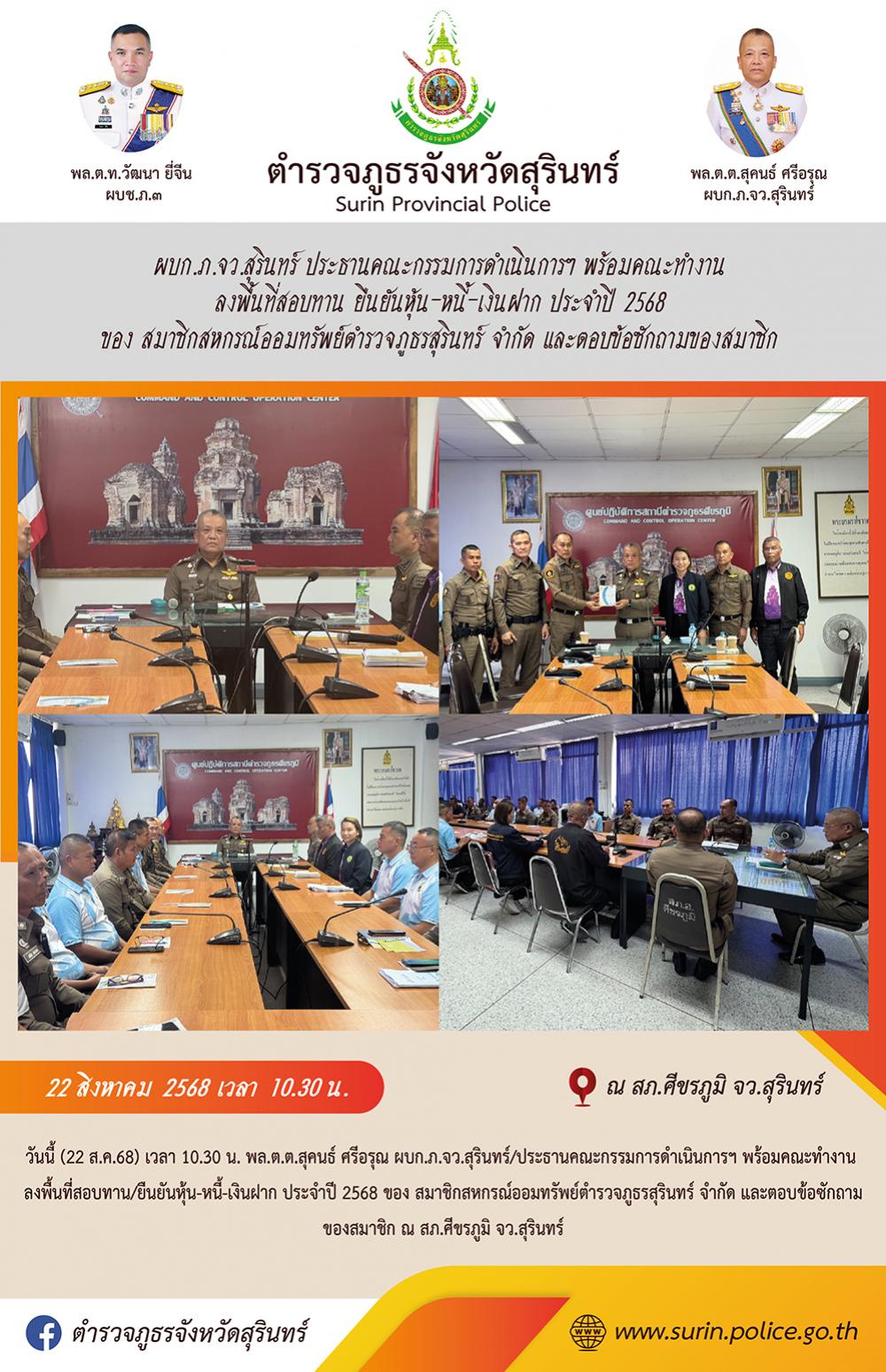 22 ส.ค. 2568 13:37:46ผบก.ภ.จว.สุรินทร์ ประธานคณะกรรมการดำเนินการฯ พร้อมคณะทำงาน ลงพื้นที่สอบทาน ยืนยันหุ้น-หนี้-เงินฝาก ประจำปี 2568 ของ สมาชิกสหกรณ์ออมทรัพย์ตำรวจภูธรสุรินทร์ จำกัด และตอบข้อซักถามของสมาชิก วันนี้ (22 ส.ค.68) เวลา 10.30 น. พล.ต.ต.สุคนธ์ ศรีอรุณ ผบก.ภ.จว.สุรินทร์/ประธานคณะกรรมการดำเนินการฯ พร้อมคณะทำงาน...