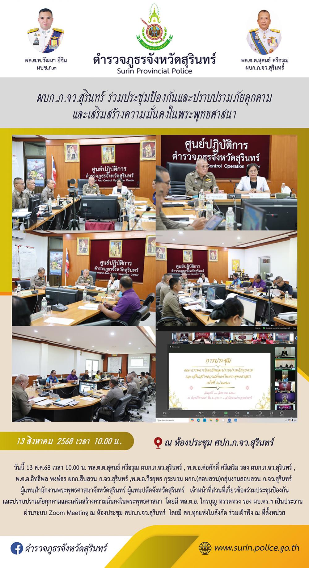 13 ส.ค. 2568 13:10:29ผบก.ภ.จว.สุรินทร์ ร่วมประชุมป้องกันและปราบปรามภัยคุกคาม และเสริมสร้างความมั่นคงในพระพุทธศาสนา วันนี้ 13 ส.ค.68 เวลา 10.00 น. พล.ต.ต.สุคนธ์ ศรีอรุณ ผบก.ภ.จว.สุรินทร์ , พ.ต.อ.ต่อศักดิ์ ศรีเสริม รอง ผบก.ภ.จว.สุรินทร์ , พ.ต.อ.อิทธิพล พงษ์ธร ผกก.สืบสวน ภ.จว.สุรินทร์ ,พ.ต.อ.วีรยุทธ กุระนาม ผกก.(สอบสวน)กล...