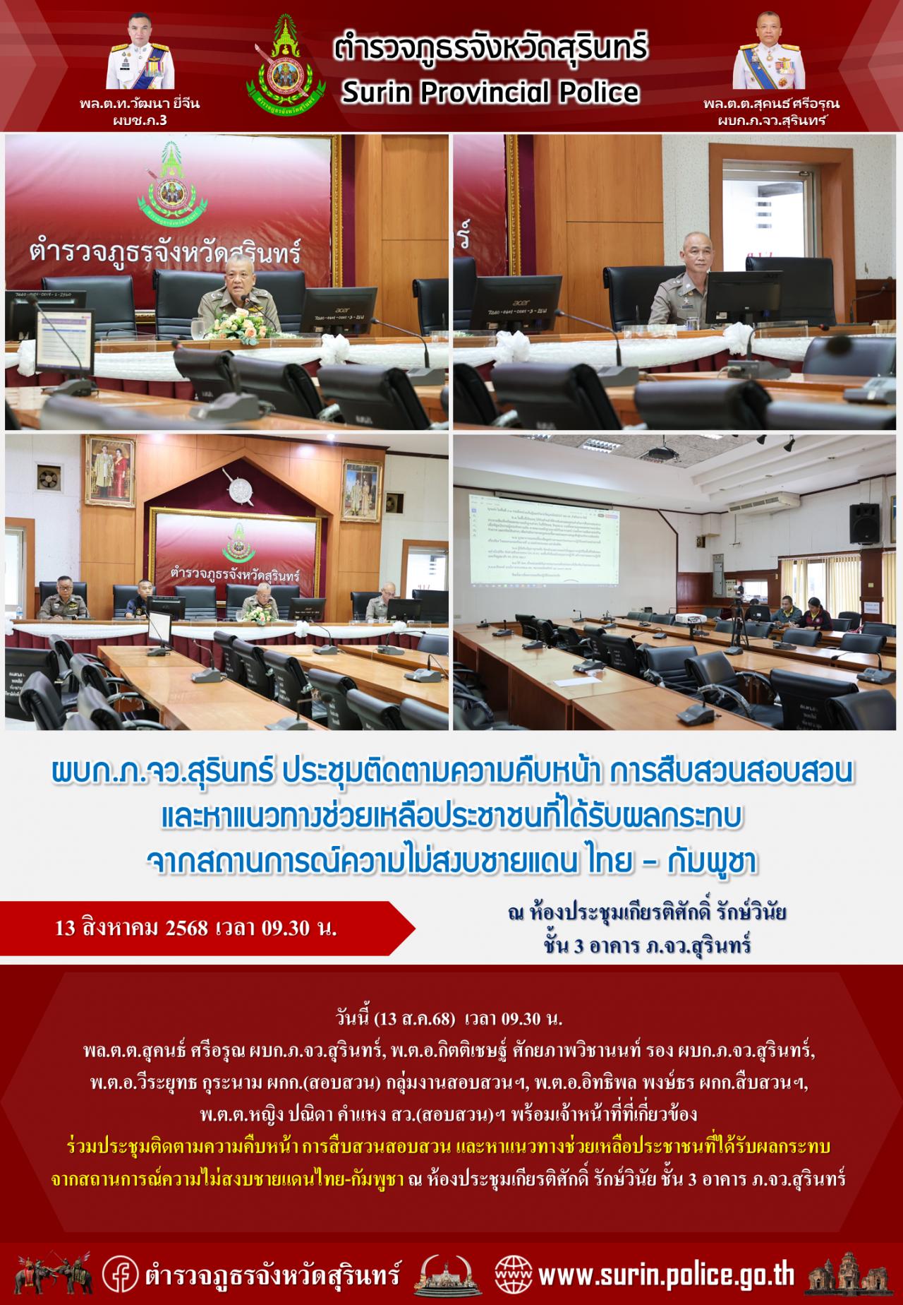 13 ส.ค. 2568 13:15:34ประชุมติดตามความคืบหน้าการสืบสวนสอบสวน และหาแนวทางช่วยเหลือประชาชนที่ได้รับผลกระทบจากสถานการณ์ความไม่สงบชายแดน ไทย-กัมพูชา วันนี้ (13 ส.ค.68) เวลา 09.30น. พล.ต.ต.สุคนธ์ ศรีอรุณ ผบก.ภ.จว.สุรินทร์, พ.ต.อ.กิตติเชษฐ์ ศักยภาพวิชานนท์ รอง ผบก.ภ.จว.สุรินทร์, พ.ต.อ.วีระยุทธ กุระนาม ผกก.(สอบสวน) กลุ่มงานสอบ...