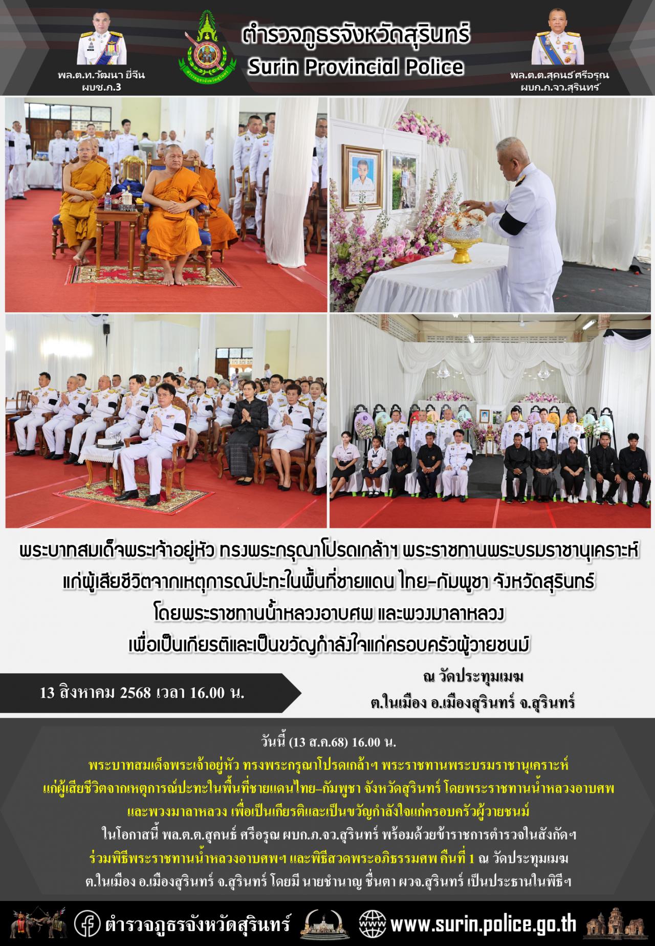 13 ส.ค. 2568 20:12:31พระบาทสมเด็จพระเจ้าอยู่หัว ทรงพระกรุณาโปรดเกล้าฯ พระราชทานพระบรมราชานุเคราะห์ แก่ผู้เสียชีวิตจากเหตุการณ์ปะทะในพื้นที่ชายแดน ไทย–กัมพูชา จังหวัดสุรินทร์ โดยพระราชทานน้ำหลวงอาบศพ และพวงมาลาหลวง เพื่อเป็นเกียรติและเป็นขวัญกำลังใจแก่ครอบครัวผู้วายชนม์ วันนี้ (13 ส.ค.68) 16.00 น. พระบาทสมเด็จพระเจ้าอย...