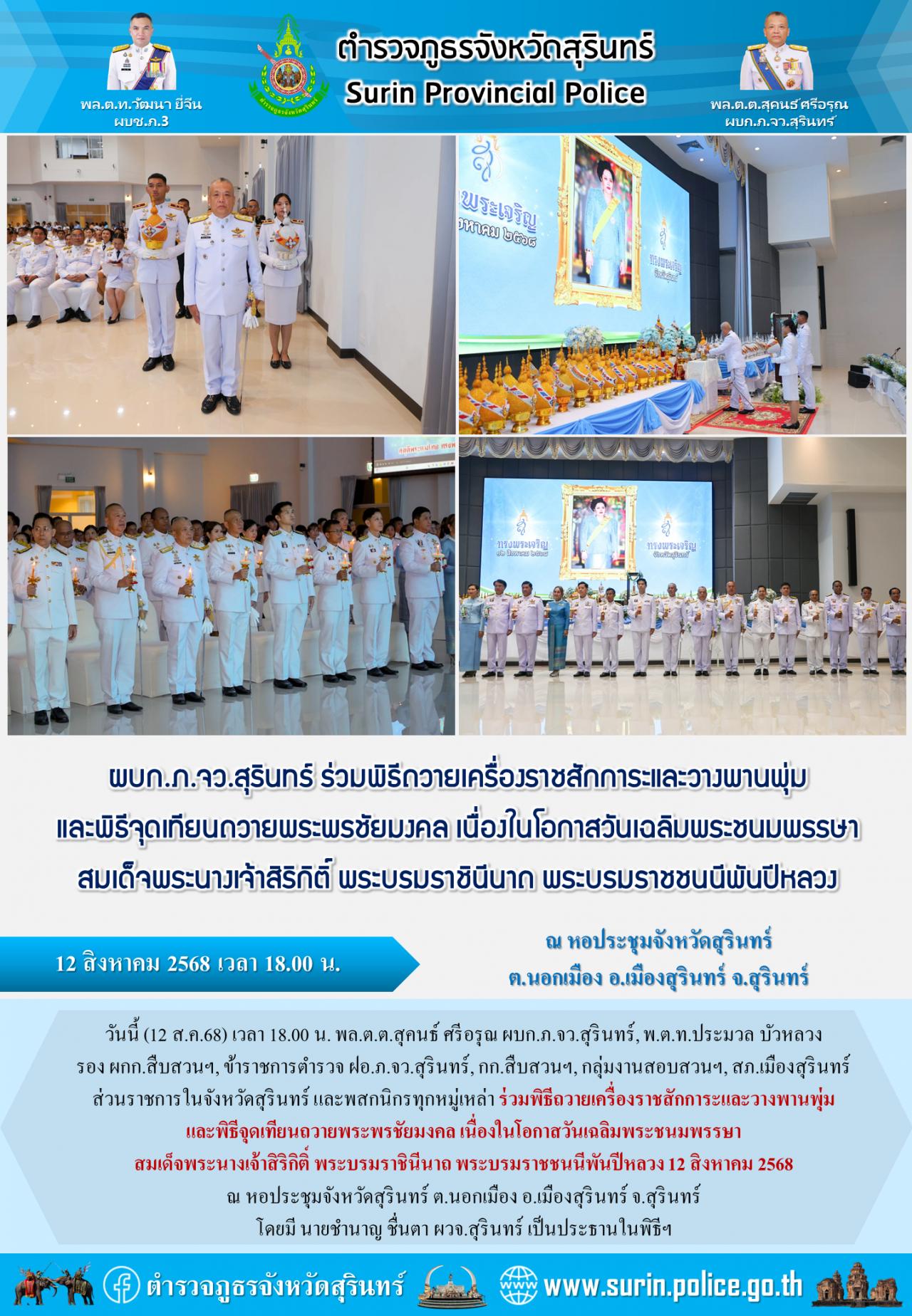 12 ส.ค. 2568 21:47:37ผบก.ภ.จว.สุรินทร์ ร่วมพิธีถวายเครื่องราชสักการะและวางพานพุ่ม และพิธีจุดเทียนถวายพระพรชัยมงคล เนื่องในโอกาสวันเฉลิมพระชนมพรรษา สมเด็จพระนางเจ้าสิริกิติ์ พระบรมราชินีนาถ พระบรมราชชนนีพันปีหลวง วันนี้ (12 ส.ค.68) เวลา 18.00 น. พล.ต.ต.สุคนธ์ ศรีอรุณ ผบก.ภ.จว.สุรินทร์, พ.ต.ท.ประมวล บัวหลวง รอง ผกก.สืบส...