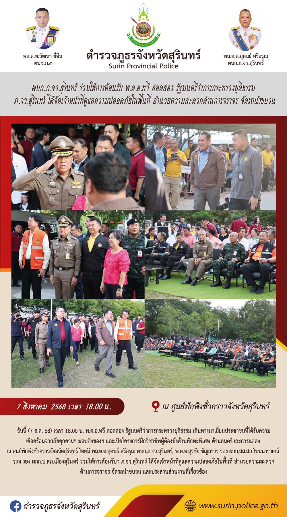 7 ส.ค. 2568 20:24:09ผบก.ภ.จว.สุรินทร์ ร่วมให้การต้อนรับ พ.ต.อ.ทวี สอดส่อง รัฐมนตรีว่าการกระทรวงยุติธรรม ภ.จว.สุรินทร์ ได้จัดเจ้าหน้าที่ดูแลความปลอดภัยในพื้นที่ อำนวยความสะดวกด้านการจราจร จัดรถนำขบวน วันนี้ (7 ส.ค. 68) เวลา 18.00 น. พ.ต.อ.ทวี สอดส่อง รัฐมนตรีว่าการกระทรวงยุติธรรม เดินทางมาเยี่ยมประชาชนที่ได้รับความ เด...