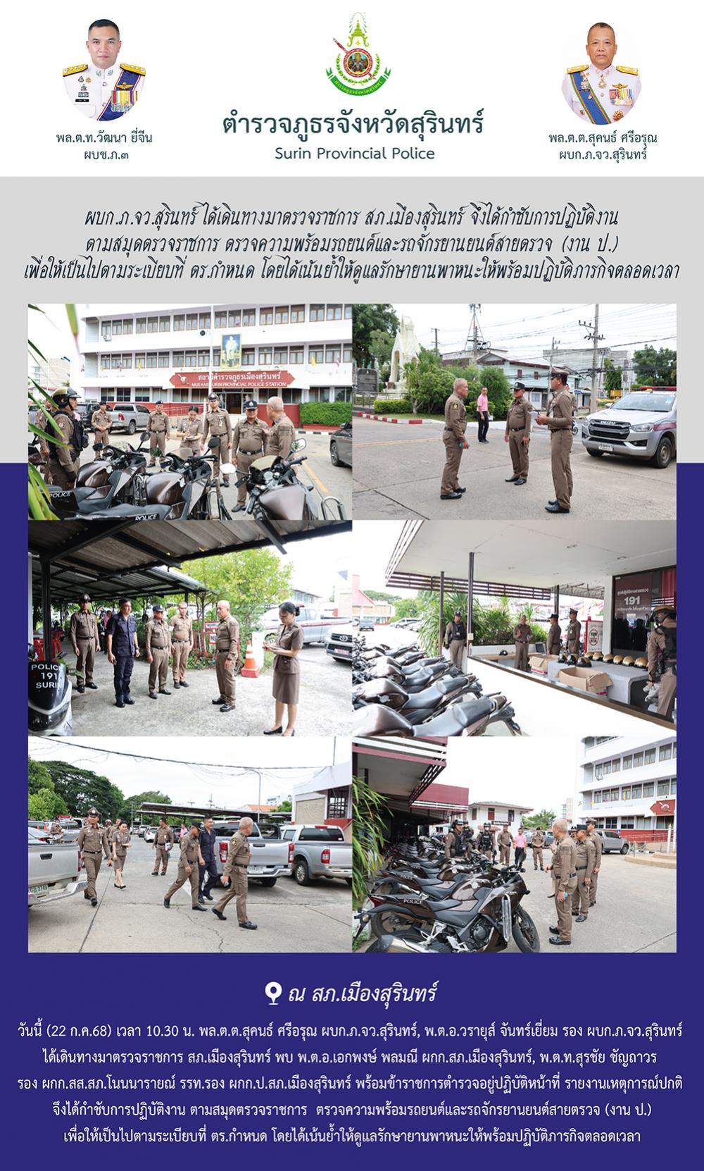 22 ก.ค. 2568 14:49:15ผบก.ภ.จว.สุรินทร์ ได้เดินทางมาตรวจราชการ สภ.เมืองสุรินทร์ จึงได้กำชับการปฏิบัติงาน ตามสมุดตรวจราชการ ตรวจความพร้อมรถยนต์และรถจักรยานยนต์สายตรวจ (งาน ป.) เพื่อให้เป็นไปตามระเบียบที่ ตร.กำหนด โดยได้เน้นย้ำให้ดูแลรักษายานพาหนะให้พร้อมปฏิบัติภารกิจตลอดเวลา วันนี้ (22 ก.ค.68) เวลา 10.30 น. พล.ต.ต.สุคนธ์...