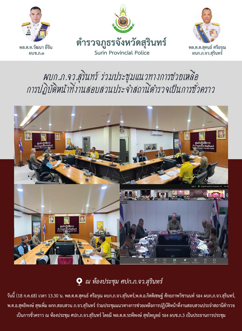 18 ก.ค. 2568 16:22:25ผบก.ภ.จว.สุรินทร์ ร่วมประชุมแนวทางการช่วยเหลือ การปฏิบัติหน้าที่งานสอบสวนประจำสถานีตำรวจเป็นการชั่วคราว วันนี้ (18 ก.ค.68) เวลา 13.30 น. พล.ต.ต.สุคนธ์ ศรีอรุณ ผบก.ภ.จว.สุรินทร์,พ.ต.อ.กิตติเชษฐ์ ศักยภาพวิชานนท์ รอง ผบก.ภ.จว.สุรินทร์, พ.ต.อ.สุทธิพงษ์ สุขเพิ่ม ผกก.สอบสวน ภ.จว.สุรินทร์ ร่วมประชุมแนวท...