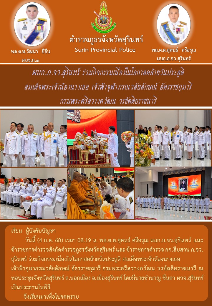 4 ก.ค. 2568 10:05:46ผบก.ภ.จว.สุรินทร์ ร่วมกิจกรรมเนื่องในโอกาสคล้ายวันประสูติ สมเด็จพระเจ้าน้องนางเธอ เจ้าฟ้าจุฬาภรณวลัยลักษณ์ อัครราชกุมารี กรมพระศรีสวางควัฒน วรขัตติยราชนารี วันนี้ (4 ก.ค. 68) เวลา 08.19 น. พล.ต.ต.สุคนธ์ ศรีอรุณ ผบก.ภ.จว.สุรินทร์ และข้าราชการตำรวจสังกัดตำรวจภูธรจังหวัดสุรินทร์ และ ข้ารา...