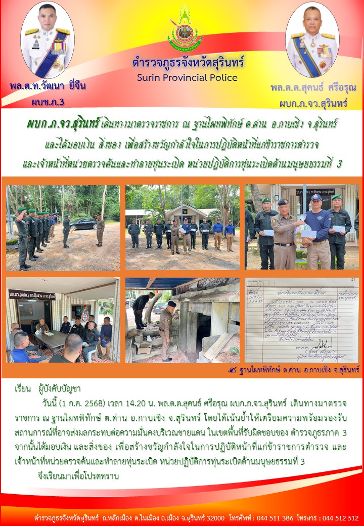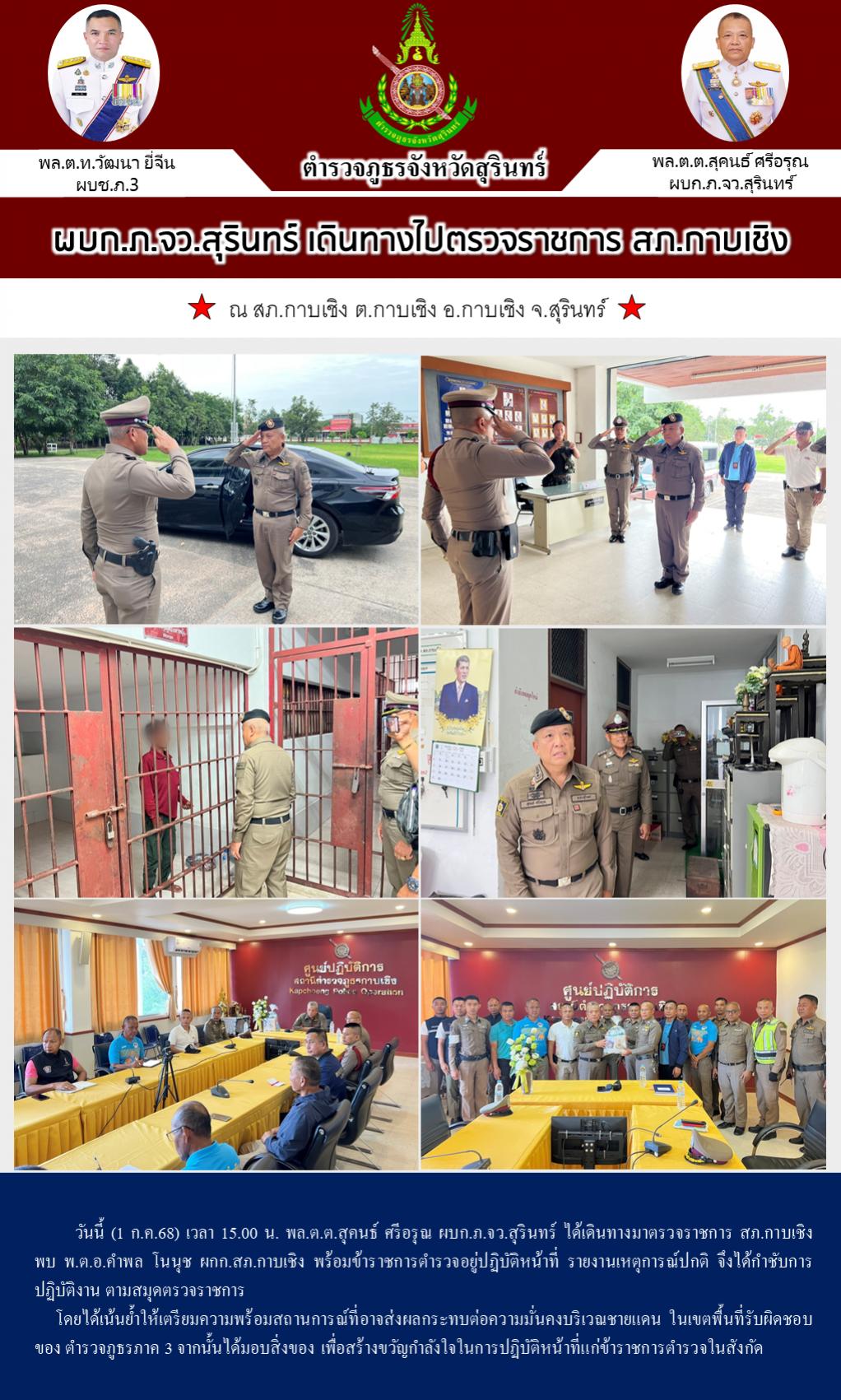 1 ก.ค. 2568 18:47:35 ผบก.ภ.จว.สุรินทร์ เดินทางไปตรวจราชการ สภ.กาบเชิง วันนี้ (1 ก.ค.68) เวลา 15.00 น. พล.ต.ต.สุคนธ์ ศรีอรุณ ผบก.ภ.จว.สุรินทร์ ได้เดินทางมาตรวจราชการ สภ.กาบเชิง พบ พ.ต.อ.คำพล โนนุช ผกก.สภ.กาบเชิง พร้อมข้าราชการตำรวจอยู่ปฏิบัติหน้าที่ รายงานเหตุการณ์ปกติ จึงได้กำชับการปฏิบัติงาน ตามสมุดตรวจราชการ ...
