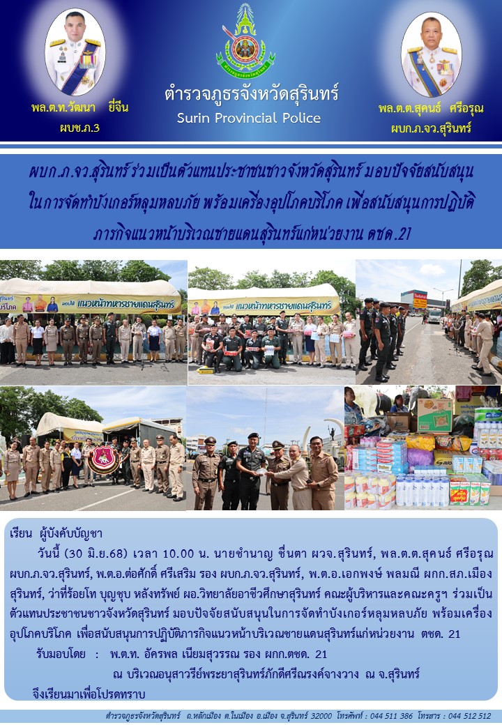 30 มิ.ย. 2568 15:41:24ผบก.ภ.จว.สุรินทร์ ร่วมเป็นตัวแทนประชาชนชาวจังหวัดสุรินทร์ มอบปัจจัยสนับสนุนในการจัดทำบังเกอร์หลุมหลบภัย พร้อมเครื่องอุปโภคบริโภค เพื่อสนับสนุนการปฏิบัติภารกิจแนวหน้าบริเวณชายแดนสุรินทร์แก่หน่วยงาน ตชด. 21 วันนี้ (30 มิ.ย.68) เวลา 10.00 น. นายชำนาญ ชื่นตา ผวจ.สุรินทร์, พล.ต.ต.สุคนธ์ ศรีอรุณ...