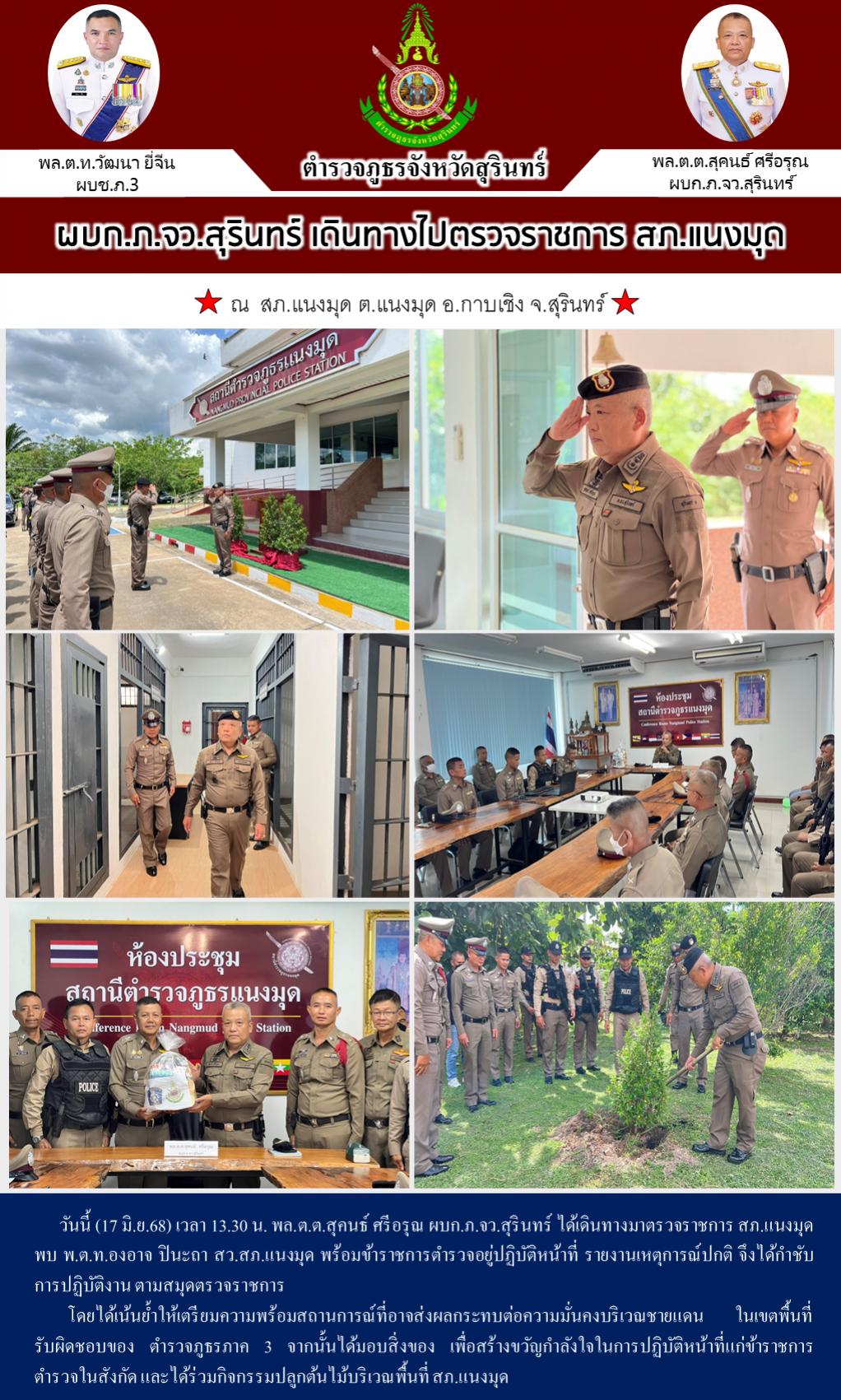 17 มิ.ย. 2568 17:32:59ผบก.ภ.จว.สุรินทร์ เดินทางไปตรวจราชการ สภ.แนงมุด วันนี้ (17 มิ.ย.68) เวลา 13.30 น. พล.ต.ต.สุคนธ์ ศรีอรุณ ผบก.ภ.จว.สุรินทร์ ได้เดินทางมาตรวจราชการ สภ.แนงมุด พบ พ.ต.ท.องอาจ ปินะถา สว.สภ.แนงมุด พร้อมข้าราชการตำรวจอยู่ปฏิบัติหน้าที่ รายงานเหตุการณ์ปกติ จึงได้กำชับการปฏิบัติงาน ตามสมุดตรวจราชการ ...