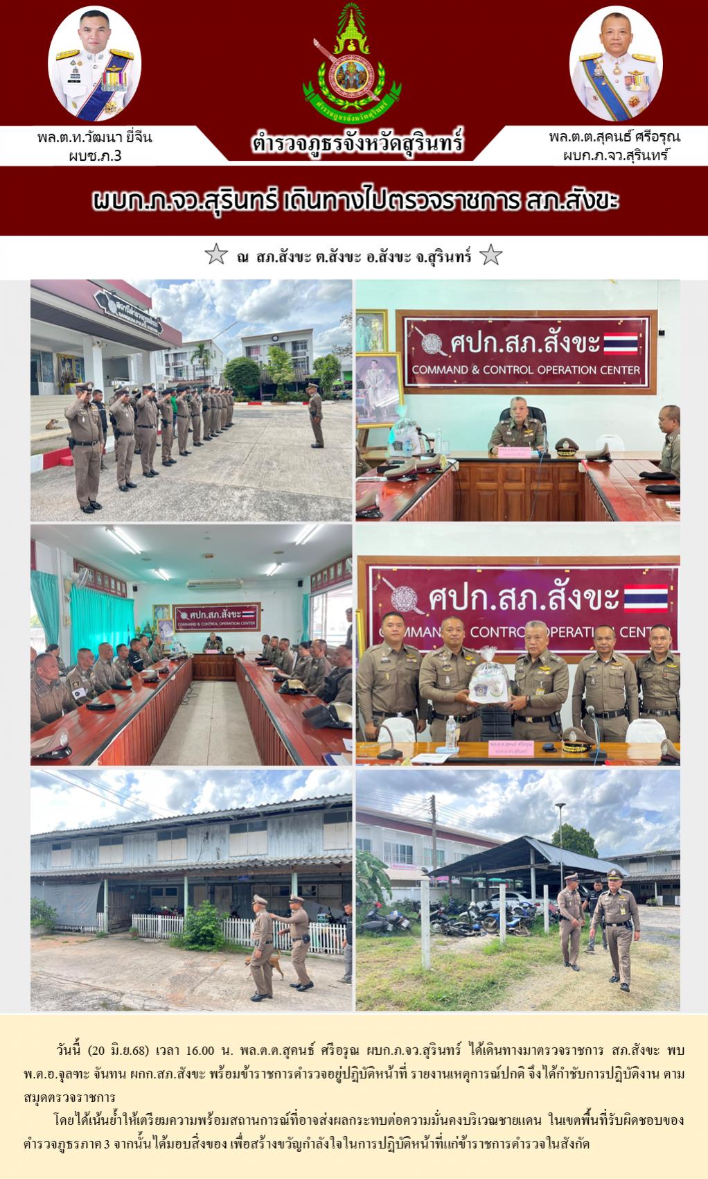 20 มิ.ย. 2568 19:52:03ผบก.ภ.จว.สุรินทร์ เดินทางไปตรวจราชการ สภ.สังขะ วันนี้ (20 มิ.ย.68) เวลา 16.00 น. พล.ต.ต.สุคนธ์ ศรีอรุณ ผบก.ภ.จว.สุรินทร์ ได้เดินทางมาตรวจราชการ สภ.สังขะ พบ พ.ต.อ.จุลฑะ จันทน ผกก.สภ.สังขะ พร้อมข้าราชการตำรวจอยู่ปฏิบัติหน้าที่ รายงานเหตุการณ์ปกติ จึงได้กำชับการปฏิบัติงาน ตามสมุดตรวจราชการ ...