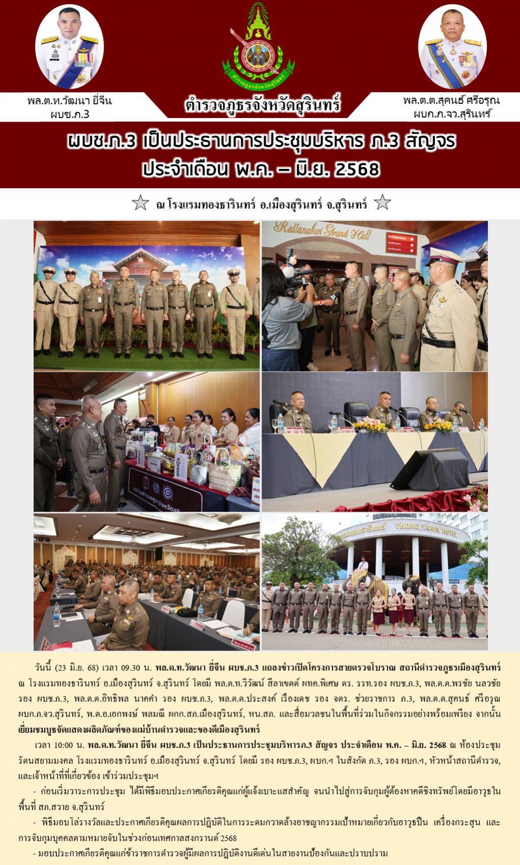 23 มิ.ย. 2568 18:32:07ผบช.ภ.3 เป็นประธานการประชุมบริหาร ภ.3 สัญจร ประจำเดือน พ.ค. – มิ.ย. 2568 วันนี้ (23 มิ.ย. 68) เวลา 09.30 น. พล.ต.ท.วัฒนา ยี่จีน ผบช.ภ.3 แถลงข่าวเปิดโครงการสายตรวจโบราณ สถานีตำรวจภูธรเมืองสุรินทร์ ณ โรงแรมทองธารินทร์ อ.เมืองสุรินทร์ จ.สุรินทร์ โดยมี พล.ต.ท.วิวัฒน์ สีลาเขตต์ ผทค.พิเศษ ตร. รร...
