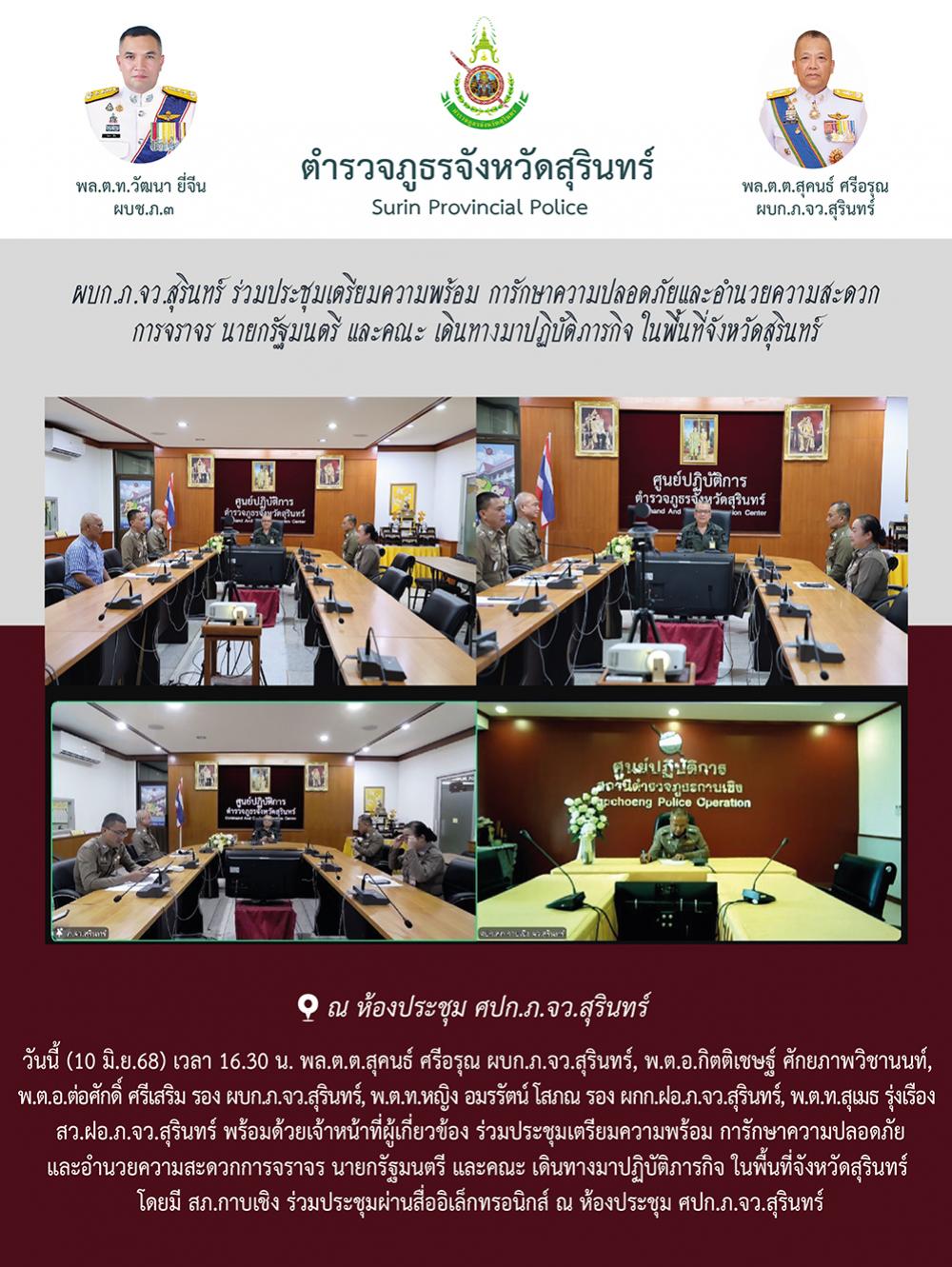 10 มิ.ย. 2568 18:36:41ผบก.ภ.จว.สุรินทร์ ร่วมประชุมเตรียมความพร้อม การักษาความปลอดภัยและอำนวยความสะดวก การจราจร นายกรัฐมนตรี และคณะ เดินทางมาปฏิบัติภารกิจ ในพื้นที่จังหวัดสุรินทร์ วันนี้ (10 มิ.ย.68) เวลา 16.30 น. พล.ต.ต.สุคนธ์ ศรีอรุณ ผบก.ภ.จว.สุรินทร์, พ.ต.อ.กิตติเชษฐ์ ศักยภาพวิชานนท์, พ.ต.อ.ต่อศักดิ์ ศรีเสริม รอง ผบก...