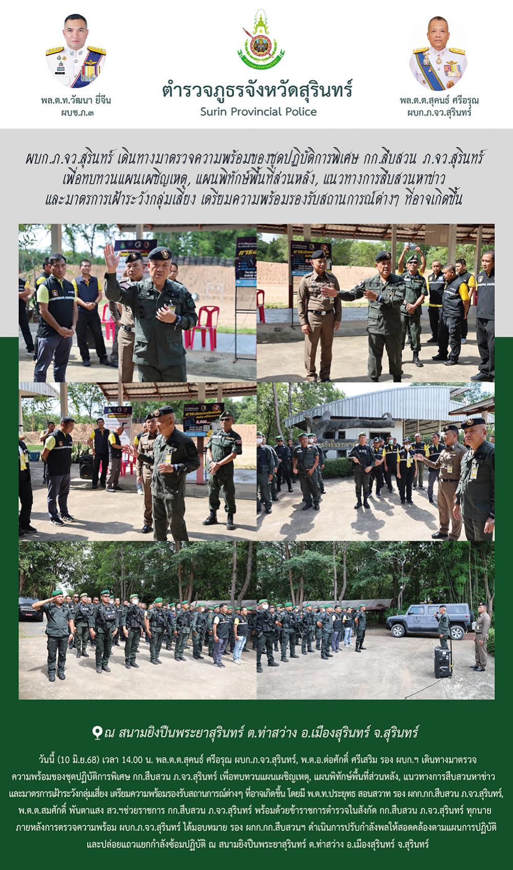 10 มิ.ย. 2568 17:09:11ผบก.ภ.จว.สุรินทร์ เดินทางมาตรวจความพร้อมของชุดปฏิบัติการพิเศษ กก.สืบสวน ภ.จว.สุรินทร์ เพื่อทบทวนแผนเผชิญเหตุ, แผนพิทักษ์พื้นที่ส่วนหลัง, แนวทางการสืบสวนหาข่าว และมาตรการเฝ้าระวังกลุ่มเสี่ยง เตรียมความพร้อมรองรับสถานการณ์ต่างๆ ที่อาจเกิดขึ้น วันนี้ (10 มิ.ย.68) เวลา 14.00 น. พล.ต.ต.สุคนธ์ ศรีอรุณ ผ...