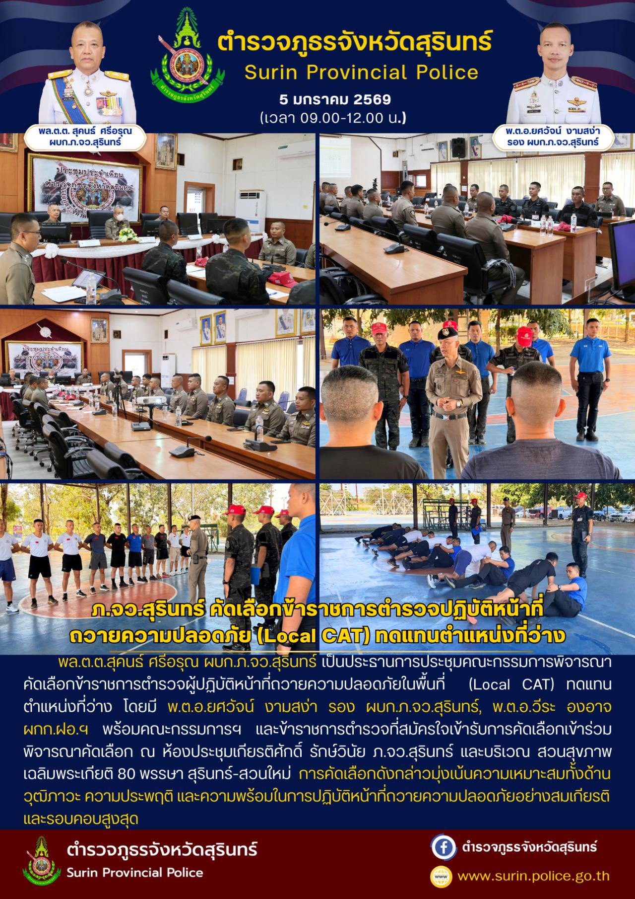 6 ม.ค. 2569 12:41:29 วันที่ 5 ม.ค.69 ระหว่างเวลา 09.00-12.00 น. พล.ต.ต.สุคนธ์ ศรีอรุณ ผบก.ภ.จว.สุรินทร์ เป็นประธานการประชุมคณะกรรมการพิจารณาคัดเลือกข้าราชการตำรวจผู้ปฏิบัติหน้าที่ถวายความปลอดภัยในพื้นที่ (Local CAT) ทดแทนตำแหน่งที่ว่าง โดยมี พ.ต.อ.ยศวัจน์ งามสง่า รอง ผบก.ภ.จว.สุรินทร์, พ.ต.อ.วีระ องอาจ ผกก.ฝอ.ฯ พร้อมคณ...