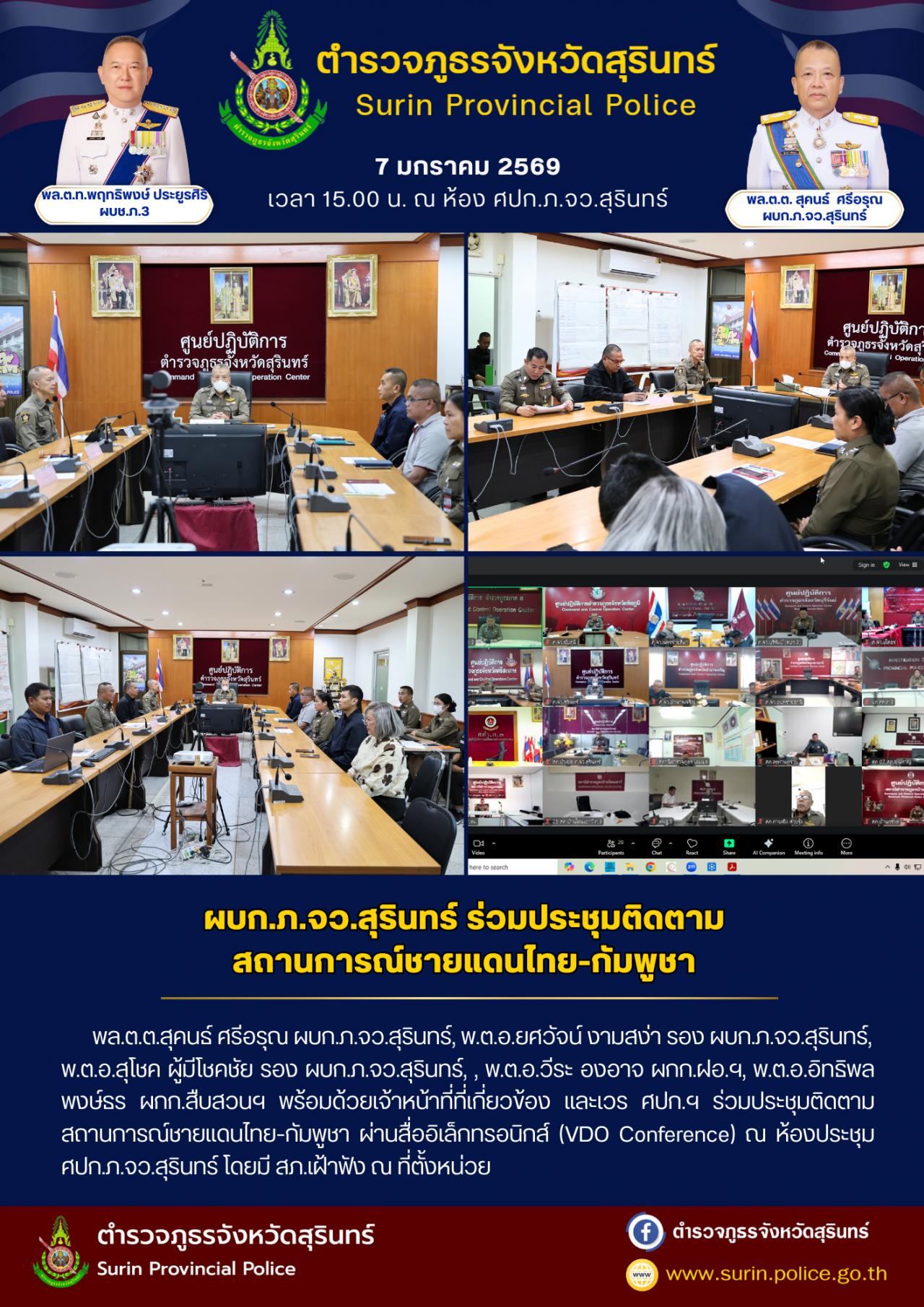 7 ม.ค. 2569 16:06:22ผบก.ภ.จว.สุรินทร์ ร่วมประชุมติดตามสถานการณ์ชายแดน ไทย-กัมพูชา วันนี้ (7 ม.ค.69) เวลา 15.00 น. พล.ต.ต.สุคนธ์ ศรีอรุณ ผบก.ภ.จว.สุรินทร์, พ.ต.อ.ยศวัจน์ งามสง่า รอง ผบก.ภ.จว.สุรินทร์, พ.ต.อ.สุโชค ผู้มีโชคชัย รอง ผบก.ภ.จว.สุรินทร์, พ.ต.อ.วีระ องอาจ ผกก.ฝอ.ฯ, พ.ต.อ.อิทธิพล พงษ์ธร ผกก.สืบสวนฯ พร้อมด้วยเจ้...