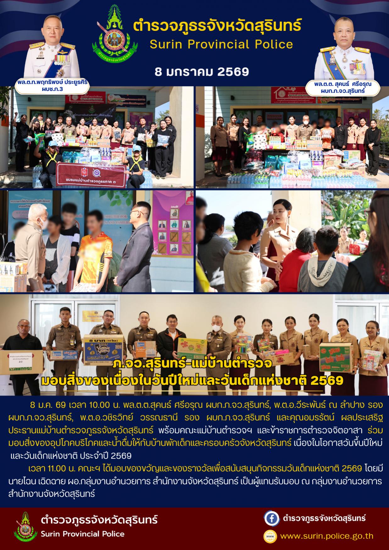 9 ม.ค. 2569 13:04:32มอบสิ่งของอุปโภคบริโภคและน้ำดื่มให้กับบ้านพักเด็กและครอบครัวจังหวัดสุรินทร์ เนื่องในโอกาสวันขึ้นปีใหม่และวันเด็กแห่งชาติ ประจำปี 2569 วันที่ 8 ม.ค.69 เวลา 10.00 น. พล.ต.ต.สุคนธ์ ศรีอรุณ ผบก.ภ.จว.สุรินทร์, พ.ต.อ.วีระพันธ์ ณ ลำปาง รอง ผบก.ภ.จว.สุรินทร์, พ.ต.อ.วชิรวิทย์ วรรณธาณี รอง ผบก.ภ.จว.สุรินทร์...
