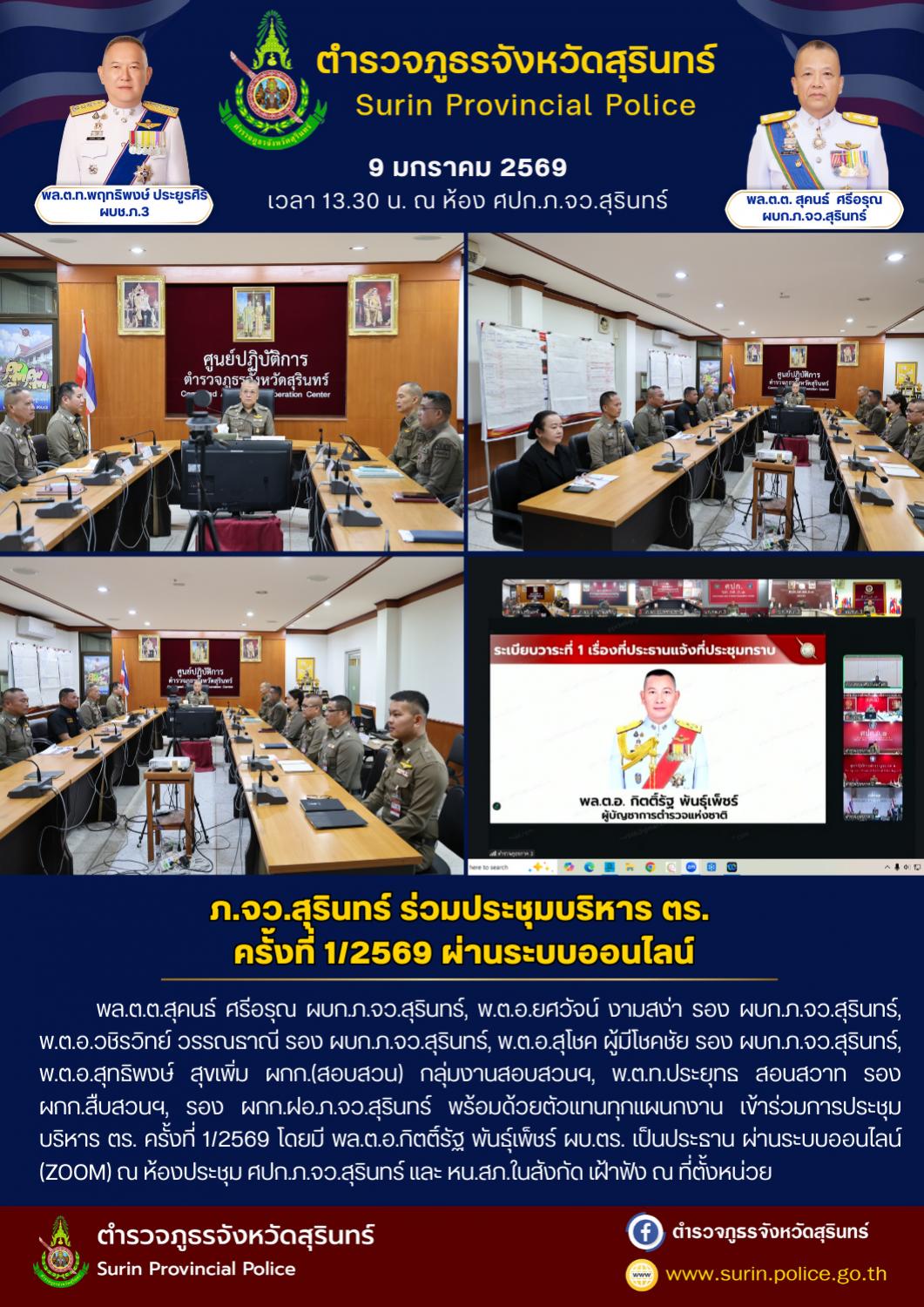 9 ม.ค. 2569 14:46:35ร่วมการประชุมบริหาร ตร. ครั้งที่ 1/2569 วันนี้ (9 ม.ค.69) เวลา 13.30 น. พล.ต.ต.สุคนธ์ ศรีอรุณ ผบก.ภ.จว.สุรินทร์, พ.ต.อ.ยศวัจน์ งามสง่า รอง ผบก.ภ.จว.สุรินทร์, พ.ต.อ.วชิรวิทย์ วรรณธาณี รอง ผบก.ภ.จว.สุรินทร์, พ.ต.อ.สุโชค ผู้มีโชคชัย รอง ผบก.ภ.จว.สุรินทร์, พ.ต.อ.สุทธิพงษ์ สุขเพิ่ม ผกก.(สอบสวน) กลุ่มงา...