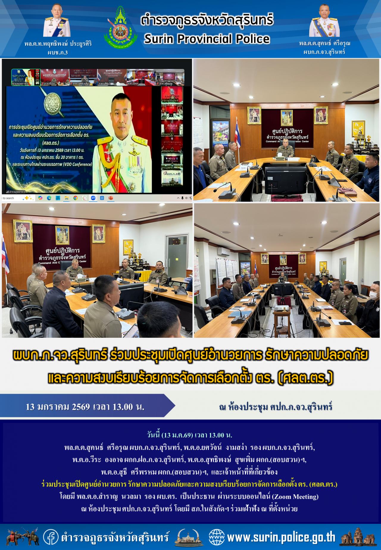 13 ม.ค. 2569 16:44:13ผบก.ภ.จว.สุรินทร์ ร่วมประชุมเปิดศูนย์อำนวยการ รักษาความปลอดภัยและความสงบเรียบร้อยการจัดการเลือกตั้ง ตร. (ศลต.ตร.) วันนี้ (13 ม.ค.69) เวลา 13.00 น. พล.ต.ต.สุคนธ์ ศรีอรุณ ผบก.ภ.จว.สุรินทร์, พ.ต.อ.ยศวัจน์ งามสง่า รอง ผบก.ภ.จว.สุรินทร์, พ.ต.อ.วีระ องอาจ ผกก.ฝอ.ภ.จว.สุรินทร์, พ.ต.อ.สุทธิพงษ์ สุขเ...