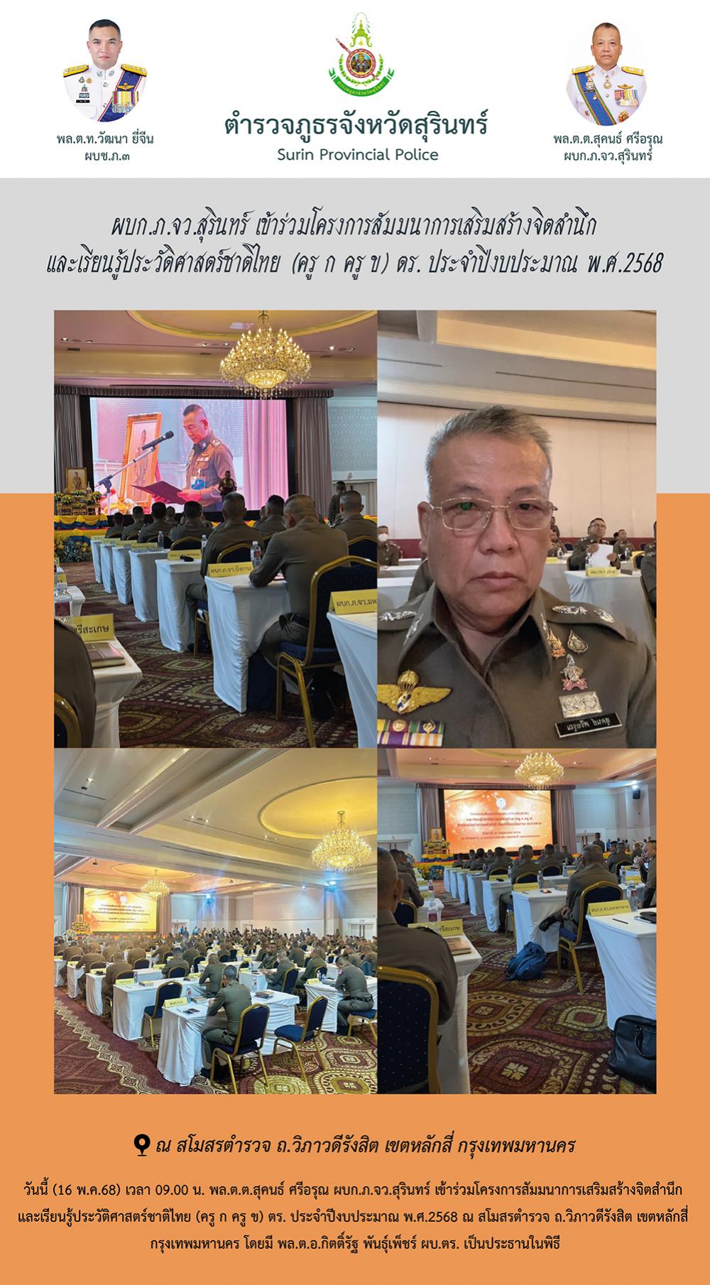 16 พ.ค. 2568 10:43:17ผบก.ภ.จว.สุรินทร์ เข้าร่วมโครงการสัมมนาการเสริมสร้างจิตสำนึก และเรียนรู้ประวัติศาสตร์ชาติไทย (ครู ก ครู ข) ตร. ประจำปีงบประมาณ พ.ศ.2568 วันนี้ (16 พ.ค.68) เวลา 09.00 น. พล.ต.ต.สุคนธ์ ศรีอรุณ ผบก.ภ.จว.สุรินทร์ เข้าร่วมโครงการสัมมนาการเสริมสร้างจิตสำนึก และเรียนรู้ประวัติศาสตร์ชาติไทย (ครู ก ครู ข) ...
