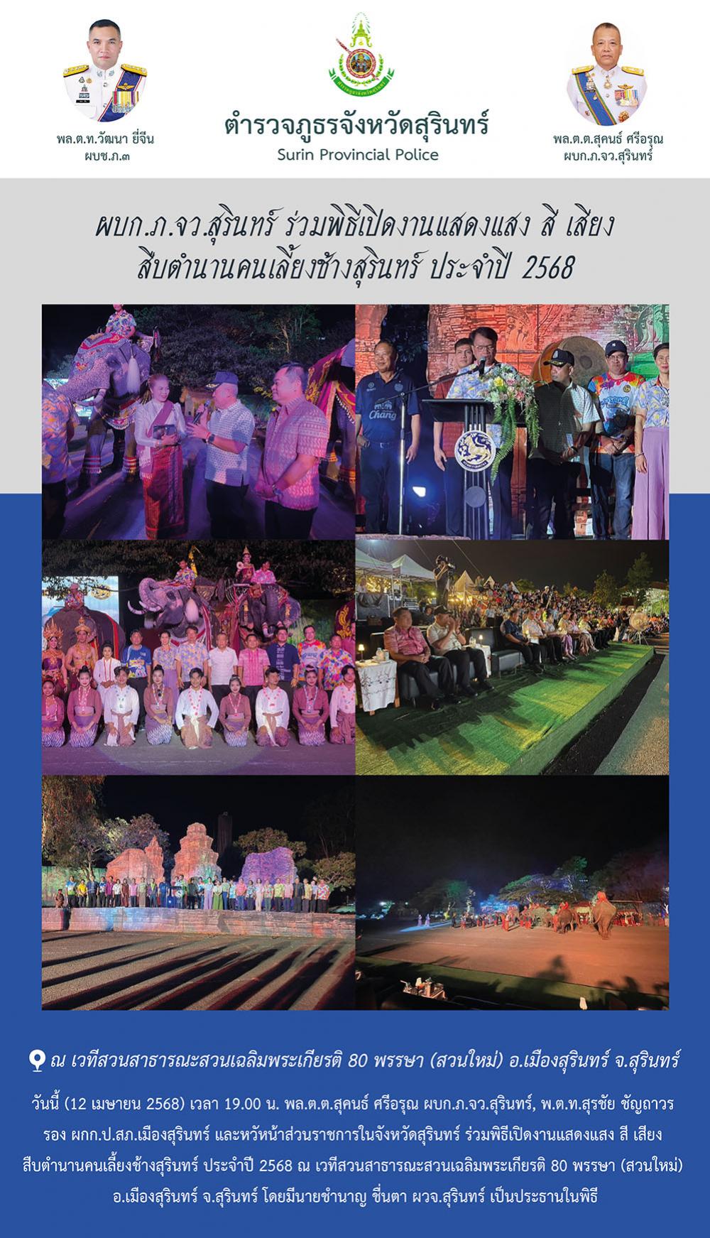 13 เม.ย. 2568 21:54:45 ผบก.ภ.จว.สุรินทร์ ร่วมพิธีเปิดงานแสดงแสง สี เสียง สืบตำนานคนเลี้ยงช้างสุรินทร์ ประจำปี 2568 วันนี้ (13 เมษายน 2568) เวลา 19.00 น. พล.ต.ต.สุคนธ์ ศรีอรุณ ผบก.ภ.จว.สุรินทร์, คุณอมรรัตน์ ผลประเสริฐ ประธานแม่บ้านตำรวจภูธรจังหวัดสุรินทร์ และหัวหน้าส่วนราชการในจังหวัดสุรินทร์ ร่วมพิธีเปิดงานแสดงแส...