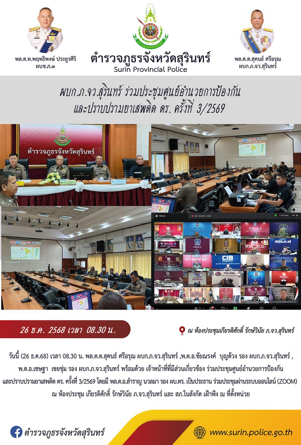 26 ธ.ค. 2568 11:16:47ผบก.ภ.จว.สุรินทร์ ร่วมประชุมศูนย์อำนวยการป้องกัน และปราบปรามยาเสพติด ตร. ครั้งที่ 3/2569 วันนี้ (26 ธ.ค.68) เวลา 08.30 น. พล.ต.ต.สุคนธ์ ศรีอรุณ ผบก.ภ.จว.สุรินทร์ ,พ.ต.อ.ชัยณรงค์ บุญด้วง รอง ผบก.ภ.จว.สุรินทร์ , พ.ต.อ.เชษฐา เชยชุ่ม รอง ผบก.ภ.จว.สุรินทร์ พร้อมด้วย เจ้าหน้าที่ที่มีส่วนเกี่ยวข้อง ร่ว...