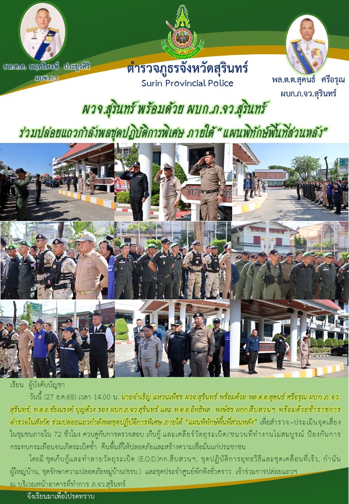 29 ธ.ค. 2568 11:40:38วันที่ 27 ธ.ค.68 เวลา 13.00 น. พล.ต.ต.สุคนธ์ ศรีอรุณ ผบก.ภ.จว.สุรินทร์ และ พ.ต.อ.อิทธิพล พงษ์ธร ผกก.สืบสวน ภ.จว.สุรินทร์ เรียกรวมชุดปฏิบัติการ ดังนี้ 1. ชุดปฏิบัติการยุทธวิธี(ชุดที่ 1-3) 2. ชุดเคลื่อนที่เร็วชุดที่ 1 และ 2 3. ชุด E.O.D. 4. ชุด ชรบ.และชุดประจำศูนย...