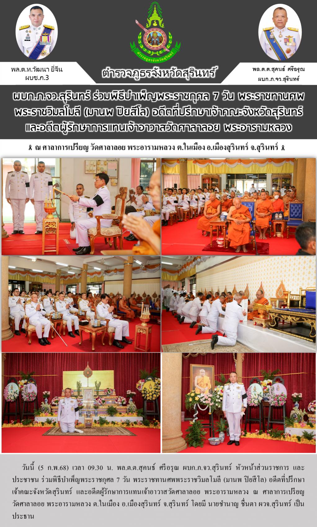 5 ก.พ. 2568 15:17:45ผบก.ภ.จว.สุรินทร์ ร่วมพิธีบำเพ็ญพระราชกุศล 7 วัน พระราชทานศพพระราชวิมลโมลี (มานพ ปิยสีโล) อดีตที่ปรึกษาเจ้าคณะจังหวัดสุรินทร์ และอดีตผู้รักษาการแทนเจ้าอาวาสวัดศาลาลอย พระอารามหลวง วันนี้ (5 ก.พ.68) เวลา 09.30 น. พล.ต.ต.สุคนธ์ ศรีอรุณ ผบก.ภ.จว.สุรินทร์ หัวหน้าส่วนราชการ และประชาชน ร่วมพิธีบำเพ...