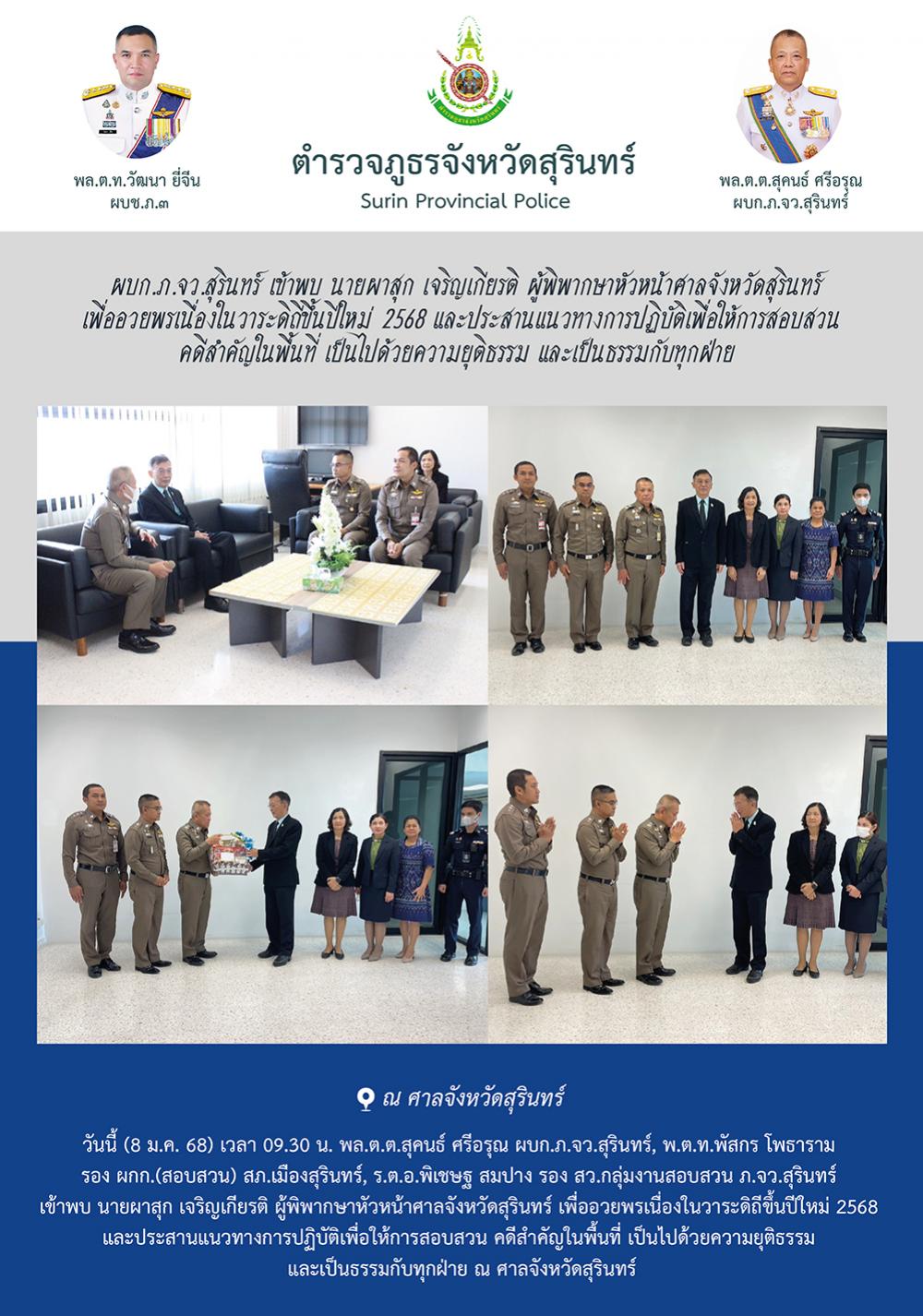8 ม.ค. 2568 15:00:24 ผบก.ภ.จว.สุรินทร์ เข้าพบ นายผาสุก เจริญเกียรติ ผู้พิพากษาหัวหน้าศาลจังหวัดสุรินทร์ เพื่ออวยพรเนื่องในวาระดิถีขึ้นปีใหม่ 2568 และประสานแนวทางการปฏิบัติเพื่อให้การสอบสวน คดีสำคัญในพื้นที่ เป็นไปด้วยความยุติธรรม และเป็นธรรมกับทุกฝ่าย วันนี้ (8 ม.ค. 68) เวลา 09.30 น. พล.ต.ต.สุคนธ์ ศรีอรุณ ผบก.ภ.จว.สุ...