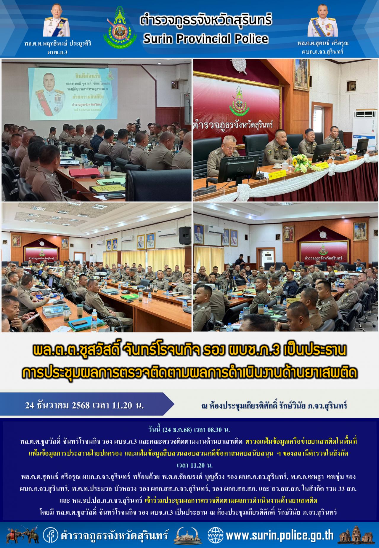24 ธ.ค. 2568 16:55:25พล.ต.ต.ชูสวัสดิ์ จันทร์โรจนกิจ รอง ผบช.ภ.3 เป็นประธานการประชุมผลการตรวจติดตามผลการดำเนินงานด้านยาเสพติด วันนี้ (24 ธ.ค.68) เวลา 08.30 น. พล.ต.ต.ชูสวัสดิ์ จันทร์โรจนกิจ รอง ผบช.ภ.3 และคณะตรวจติดตามงานด้านยาเสพติด ตรวจแฟ้มข้อมูลเครือข่ายยาเสพติดในพื้นที่ แฟ้มข้อมูลการประสานฝ่ายปกครอง และแฟ้มข้อมูลส...