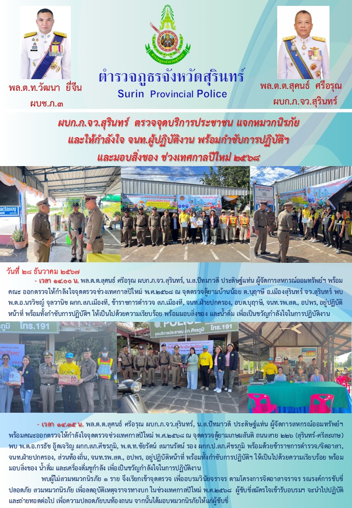 29 ธ.ค. 2567 12:57:27ผบก.ภ.จว.สุรินทร์ ออกตรวจให้กำลังใจจุดตรวจช่วงเทศกาลปีใหม่ พ.ศ.2568 วันที่ 28 ธ.ค.67 เวลา 14.00 น. พล.ต.ต.สุคนธ์ ศรีอรุณ ผบก.ภ.จว.สุรินทร์, น.ส.ปัทมาวดี ประดิษฐ์แท่น ผู้จัดการสหกรณ์ออมทรัพย์ฯ พร้อมคณะ ออกตรวจให้กำลังใจจุดตรวจช่วงเทศกาลปีใหม่ พ.ศ.2568 ณ จุดตรวจตู้ยามบ้านน้อย ต.บุฤาษี อ.เมืองสุริน...