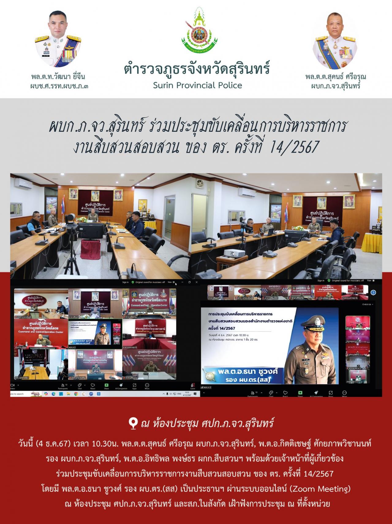 4 ธ.ค. 2567 14:43:57 ผบก.ภ.จว.สุรินทร์ ร่วมประชุมขับเคลื่อนการบริหารราชการ งานสืบสวนสอบสวน ของ ตร. ครั้งที่ 14/2567 วันนี้ (4 ธ.ค.67) เวลา 10.30น. พล.ต.ต.สุคนธ์ ศรีอรุณ ผบก.ภ.จว.สุรินทร์, พ.ต.อ.กิตติเชษฐ์ ศักยภาพวิชานนท์ รอง ผบก.ภ.จว.สุรินทร์, พ.ต.อ.อิทธิพล พงษ์ธร ผกก.สืบสวนฯ พร้อมด้วยเจ้าหน้าที่ผู้เกี่ยวข้อง ร่วมปร...