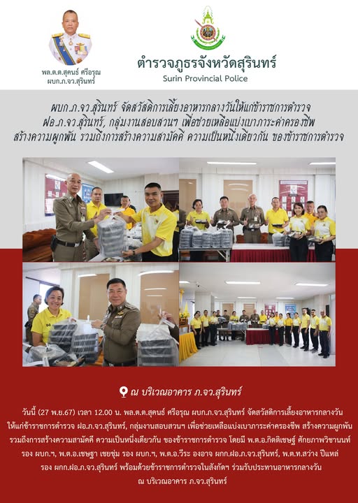 27 พ.ย. 2567 16:19:07 ผบก.ภ.จว.สุรินทร์ จัดสวัสดิการเลี้ยงอาหารกลางวันให้แก่ข้าราชการตำรวจ ฝอ.ภ.จว.สุรินทร์, กลุ่มงานสอบสวนฯ เพื่อช่วยเหลือแบ่งเบาภาระค่าครองชีพ สร้างความผูกพัน รวมถึงการสร้างความสามัคคี ความเป็นหนึ่งเดียวกัน ของข้าราชการตำรวจ วันนี้ (27 พ.ย.67) เวลา 12.00 น. พล.ต.ต.สุคนธ์ ศรีอรุณ ผบก.ภ.จว.สุรินทร์ จัด...