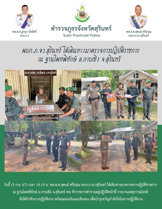 3 ก.ย. 2567 15:41:33ผบก.ภ.จว.สุรินทร์ ร่วมให้การต้อนรับ พล.อ.อ.อิทธิศักดิ์ ศรีสังข์ ประจำสำนักราชวังพิเศษ ระดับ 10 เชิญชุดหนังสือธรรมนาวา “วัง” และสิ่งของพระราชทานไปถวายพระสงฆ์ วันนี้ (3 ก.ย.67) เวลา 10.00 น. พล.ต.ต.สุคนธ์ ศรีอรุณ ผบก.ภ.จว.สุรินทร์, พ.ต.อ.สราวุธ ศรีวิฑูรย์ศักดิ์ ผกก.สภ.บัวเชด พร้อมด้วยหัวหน้าส่วนราช...