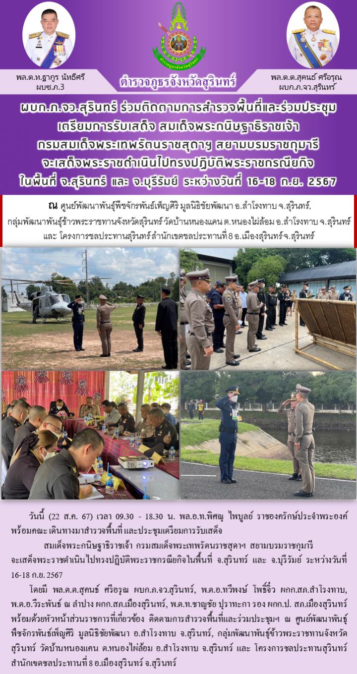 22 ส.ค. 2567 20:13:45ผบก.ภ.จว.สุรินทร์ ร่วมติดตามการสำรวจพื้นที่และร่วมประชุมเตรียมการรับเสด็จ สมเด็จพระกนิษฐาธิราชเจ้า กรมสมเด็จพระเทพรัตนราชสุดาฯ สยามบรมราชกุมารี จะเสด็จพระราชดำเนินไปทรงปฏิบัติพระราชกรณียกิจ ในพื้นที่ จ.สุรินทร์ และ จ.บุรีรัมย์ ระหว่างวันที่ 16-18 ก.ย. 2567 วันนี้ (22 ส.ค. 67) เวลา 09.30 - 18.30 น....