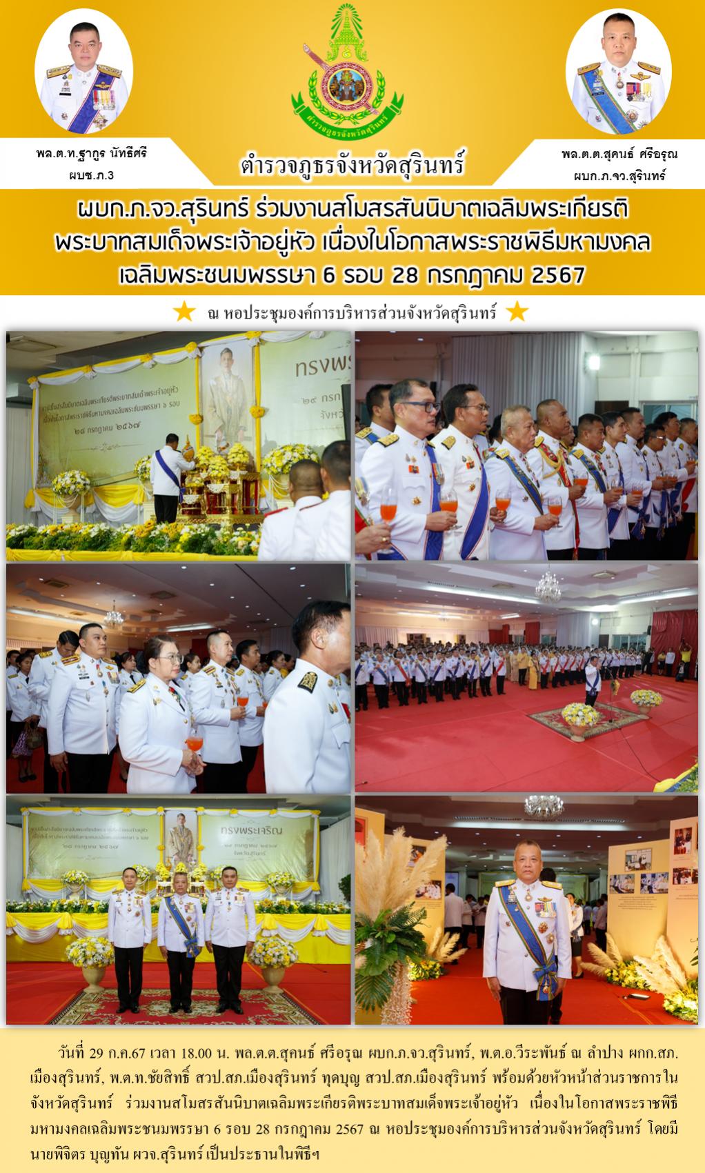 30 ก.ค. 2567 08:51:25ผบก.ภ.จว.สุรินทร์ ร่วมงานสโมสรสันนิบาตเฉลิมพระเกียรติ พระบาทสมเด็จพระเจ้าอยู่หัว เนื่องในโอกาสพระราชพิธีมหามงคลเฉลิมพระชนมพรรษา 6 รอบ 28 กรกฎาคม 2567 วันที่ 29 ก.ค.67 เวลา 18.00 น. พล.ต.ต.สุคนธ์ ศรีอรุณ ผบก.ภ.จว.สุรินทร์, พ.ต.อ.วีระพันธ์ ณ ลำปาง ผกก.สภ.เมืองสุรินทร์, พ.ต.ท.ชัยสิทธิ์ สวป.สภ.เมืองสุร...