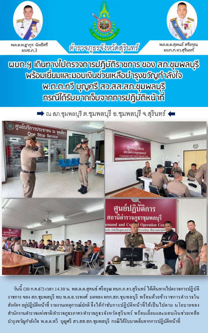 30 ก.ค. 2567 18:37:20ผบก.ฯ เดินทางไปตรวจการปฏิบัติราชการ ของ สภ.ชุมพลบุรี พร้อมเยี่ยมและมอบเงินช่วยเหลือบำรุงขวัญกำลังใจ พ.ต.ต.ทวี บุญศรี สว.สส.สภ.ชุมพลบุรี กรณีได้รับบาดเจ็บจากการปฏิบัติหน้าที่ วันนี้ (30 ก.ค.67) เวลา 14.30 น. พล.ต.ต.สุคนธ์ ศรีอรุณ ผบก.ภ.จว.สุรินทร์ ได้เดินทางไปตรวจการปฏิบัติราชการ ของ สภ.ชุมพลบุ...